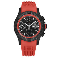 Black stainless steel case with a red rubber strap. Uni-directional rotating black stainless steel bezel. Black dial with silver-tone hands and index hour markers. Minute markers around the outer rim. Dial Type: Analog. Luminescent hands and markers. Day of the week and date display at the 3 o'clock position. Chronograph - three sub-dials displaying: 60 second, 30 minute and 12 hour. ETA-Valjoux Caliber 7750 Automatic movement, containing 25 Jewels, bitting at 28800 vph, and has a power reserve of approximately 44 hours. Scratch resistant sapphire crystal. Screw down crown. Transparent case back. Round case shape, case size: 43.5 mm, case thickness: 15.6 mm. Band width: 22 mm, band length: 8 inches. Deployment with push button release clasp. Water resistant at 100 meters / 330 feet. Functions: chronograph, date, day, hour, minute, second. Additional Info: hours, minutes, seconds, day-date, chronograph. Air Speed Series. Luxury watch style. Watch label: Swiss Made. Revue Thommen Air speed Chronograph Black Dial Men's Watch 16071.6676. INFORMATION Brand: Revue Thommen Series: Air Speed Collection Name: Air speed Gender: Mens Model: 16071.6676 Watch Label: Swiss Made Movement: Automatic Engine: ETA-Valjoux Caliber 7750 Power Reserve: 44 hours CASE Case Size: 43.5 mm Case Thickness: 15.6 mm Case Material: Stainless Steel Case Shape: Round Case Back: Transparent BAND Band Material: Rubber Band Type: Strap Band Color: Red Band Length: 8 inches Band Width: 22 mm Clasp: Deployment with Push Button Release DIAL Dial Color: Black Type: Analog Crystal: Scratch Resistant Sapphire Hands: Silver-tone Dial Markers: Index Second Markers: Minute Markers around the outer rim Sub Dials: Three - 60 Second, 30 Minute and 12 Hour Luminiscence: Hands and Markers Bezel: Uni-directional Rotating Bezel Color: Black Bezel Material: Stainless Steel Crown: Screw Down FEATURES Water Resistance: 100 meters / 330 feet Calendar: Day of the Week and Date display at the 3 o'clock position Functions: Chronograph, Date, Day, Hour, Minute, Second Watch Features: Chronograph, Stainless Steel, Rubber, Analog ADDITIONAL INFO Watch Style: Luxury Warranty: 2 Year Jomashop Warranty Additional Info: Hours, Minutes, Seconds, Day-Date, Chronograph Jomashop Sku: Y-A2D86 Department: Watches Category: Watches
