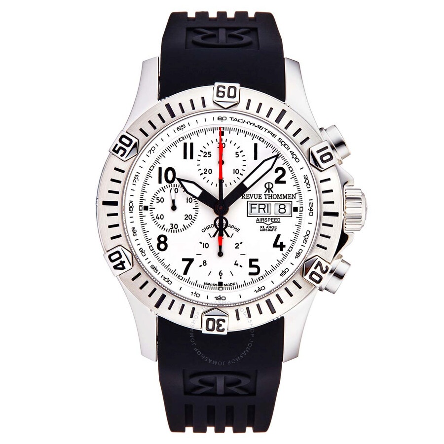 Stainless steel case with a black leather strap. Uni-directional rotating stainless steel bezel. Silver dial with black luminescent, red chronograph hands hands and Arabic numeral hour markers. Minute markers. Tachymeter markers around the outer rim. Dial Type: Analog. Luminescent hands and markers. Day of the week and date display at the 3 o'clock position. Chronograph - three sub-dials displaying: 60 second, 30 minute and 12 hour. ETA-Valjoux caliber 7750 automatic movement, containing 25 Jewels, bitting at 28800 vph, and has a power reserve of approximately 44 hours. Scratch resistant sapphire crystal. Screw down crown. Transparent see through case back. Round case shape. Case size: 45 mm. Case thickness: 15.6 mm. Band width: 22 mm. Fold over clasp with a safety release. Water resistant at 100 meters / 330 feet. Functions: chronograph, tachymeter, date, day of the week, hour, minute, second. Air Speed Xl Series. Sport watch style. Watch label: Swiss Made. Revue Thommen Air Speed XL Chronograph Automatic Silver Dial Men's Watch 16071.6822. INFORMATION Brand: Revue Thommen Series: Air Speed Xl Collection Name: Air Speed XL Gender: Mens Model: 16071.6822 Watch Label: Swiss Made Movement: Automatic Engine: ETA-Valjoux Caliber 7750 Power Reserve: 44 Hours CASE Case Size: 45 mm Case Thickness: 15.6 mm Case Material: Stainless Steel Case Shape: Round Case Back: Transparent See Through BAND Band Material: Leather Band Type: Strap Band Color: Black Band Width: 22 mm Clasp: Fold Over with Safety Release DIAL Dial Color: Silver Type: Analog Crystal: Scratch Resistant Sapphire Hands: Black luminescent, Red chronograph hands Dial Markers: Arabic Numeral Second Markers: Minute Markers. Tachymeter Markers around the outer rim Sub Dials: Three - 60 Second, 30 Minute and 12 Hour Luminiscence: Hands and Markers Bezel: Uni-directional Rotating Bezel Color: Silver-tone Bezel Material: Stainless Steel Crown: Screw Down FEATURES Water Resistance: 100 meters / 330 feet Calendar: Day of the Week and Date display at the 3 o'clock position Functions: Chronograph, Tachymeter, Date, Day of the Week, Hour, Minute, Second Watch Features: Chronograph, Stainless Steel, Leather, Analog ADDITIONAL INFO Watch Style: Sport Warranty: 2 Year Jomashop Warranty Jomashop Sku: RVT-16071-6822 Department: Watches Category: Watches