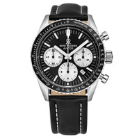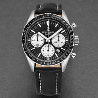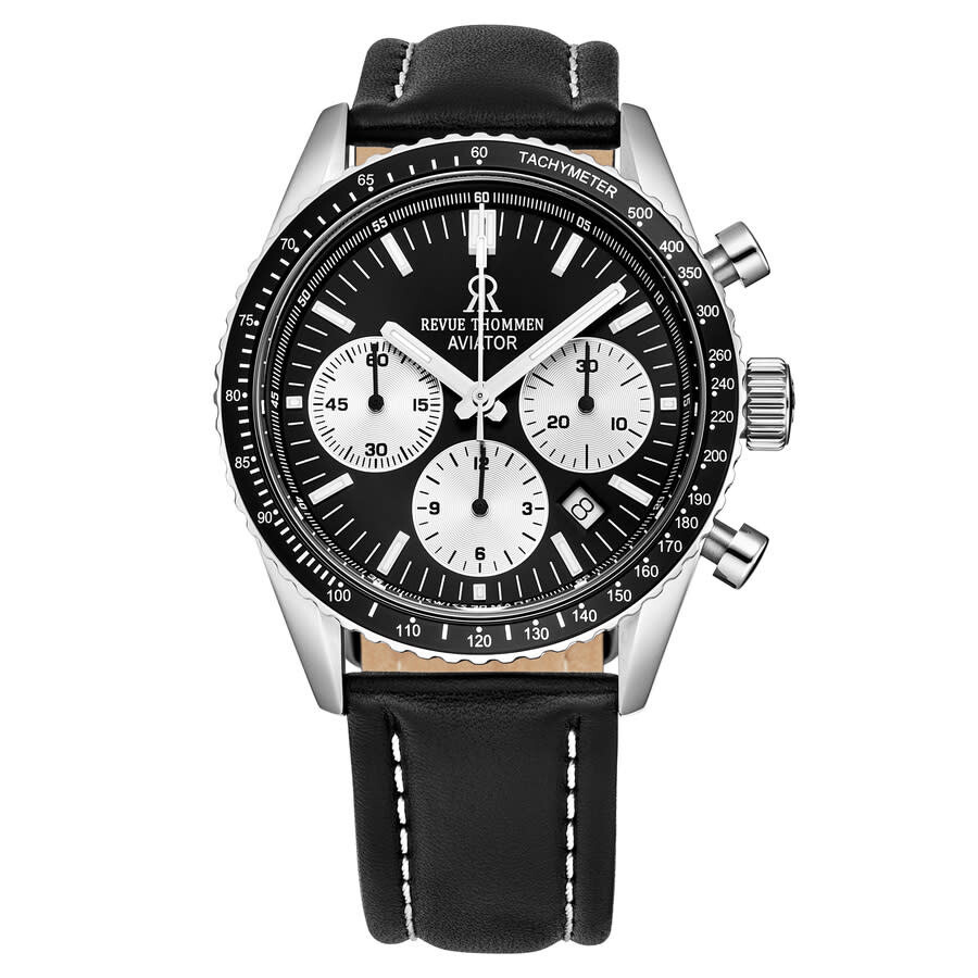 Stainless steel case with a black leather strap. Uni-directional rotating stainless steel bezel with an inlaid black ring showing tachymeter markings. Black dial with luminou silver-tone hands and index hour markers. Arabic numeral minute markers (at 5 minute intervals). Minute markers around the outer rim. Dial Type: Analog. Luminescent hands and markers. Date display between the 4 and 5 o'clock positions. Chronograph - three white sub-dials displaying: 60 second, 30 minute and 12 hour. Sellita calibre SW510A automatic movement, based upon Sellita SW500-1, containing 27 Jewels, bitting at 28800 vph, and has a power reserve of approximately 48 hours. Scratch resistant sapphire crystal. Pull / push crown. Transparent case back. Round case shape. Case size: 42 mm. Case thickness: 15 mm. Band width: 22 mm. Band length: 8 inches. Tang clasp. Water resistant at 50 meters / 165 feet. Functions: chronograph, tachymeter, date, hour, minute, second. Aviator Series. Sport watch style. Watch label: Swiss Made. Revue Thommen Aviator Chronograph Automatic Black Dial Men's Watch 17000.6534. INFORMATION Brand: Revue Thommen Series: Aviator Collection Name: Aviator Gender: Mens Model: 17000.6534 Watch Label: Swiss Made Movement: Automatic Engine: Sellita Calibre SW510A Power Reserve: 48 hours CASE Case Size: 42 mm Case Thickness: 15 mm Case Material: Stainless Steel Case Shape: Round Case Back: Transparent BAND Band Material: Leather Band Type: Strap Band Color: Black Band Length: 8 inches Band Width: 22 mm Clasp: Tang DIAL Dial Color: Black Type: Analog Crystal: Scratch Resistant Sapphire Hands: Luminou Silver-tone Dial Markers: Index Second Markers: Arabic Numeral Minute Markers (at 5 minute intervals). Minute Markers around the outer rim Sub Dials: Three - 60 Second, 30 Minute and 12 Hour Luminiscence: Hands and Markers Bezel: Uni-directional Rotating Bezel Color: Silver-tone Bezel Material: Stainless Steel with an inlaid Black Ring showing Tachymeter Markings Crown: Pull / Push FEATURES Water Resistance: 50 meters / 165 feet Calendar: Date display between the 4 and 5 o'clock positions Functions: Chronograph, Tachymeter, Date, Hour, Minute, Second Watch Features: Chronograph, Stainless Steel, Leather, Analog ADDITIONAL INFO Watch Style: Sport Warranty: 2 Year Jomashop Warranty Jomashop Sku: Y-106081 Department: Watches Category: Watches