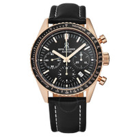 Rose gold-tone stainless steel case with a black leather strap. Uni-directional rotating rose gold-tone bezel with an inlaid black ring showing tachymeter markings. Black dial with luminous rose gold-tone hands and index hour markers. Arabic numeral minute markers (at 5 minute intervals). Minute markers around the outer rim. Dial Type: Analog. Luminescent hands and markers. Date display between the 4 and 5 o'clock positions. Chronograph - three sub-dials displaying: 60 second, 30 minute and 12 hour. Sellita calibre SW510A automatic movement, based upon Sellita SW500-1, containing 27 Jewels, bitting at 28800 vph, and has a power reserve of approximately 48 hours. Scratch resistant sapphire crystal. Pull / push crown. Transparent case back. Round case shape. Case size: 42 mm. Case thickness: 15 mm. Band width: 22 mm. Band length: 8 inches. Tang clasp. Water resistant at 50 meters / 165 feet. Functions: chronograph, tachymeter, date, hour, minute, second. Aviator Series. Sport watch style. Watch label: Swiss Made. Revue Thommen Aviator Chronograph Automatic Black Dial Men's Watch 17000.6567. INFORMATION Brand: Revue Thommen Series: Aviator Collection Name: Aviator Gender: Mens Model: 17000.6567 Watch Label: Swiss Made Movement: Automatic Engine: Sellita Calibre SW510A Power Reserve: 48 hours CASE Case Size: 42 mm Case Thickness: 15 mm Case Material: Stainless Steel Case Shape: Round Case Back: Transparent BAND Band Material: Leather Band Type: Strap Band Color: Black Band Length: 8 inches Band Width: 22 mm Clasp: Tang DIAL Dial Color: Black Type: Analog Crystal: Scratch Resistant Sapphire Hands: Luminous Rose Gold-tone Dial Markers: Index Second Markers: Arabic Numeral Minute Markers (at 5 minute intervals). Minute Markers around the outer rim Sub Dials: Three - 60 Second, 30 Minute and 12 Hour Luminiscence: Hands and Markers Bezel: Uni-directional Rotating Bezel Color: Rose Gold-tone Bezel Material: Stainless Steel with an inlaid Black Ring showing Tachymeter Markings Crown: Pull / Push FEATURES Water Resistance: 50 meters / 165 feet Calendar: Date display between the 4 and 5 o'clock positions Functions: Chronograph, Tachymeter, Date, Hour, Minute, Second Watch Features: Chronograph, Stainless Steel, Leather, Gold, Analog ADDITIONAL INFO Watch Style: Sport Warranty: 2 Year Jomashop Warranty Jomashop Sku: Y-106073 Department: Watches Category: Watches