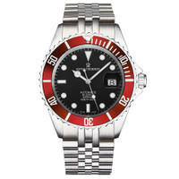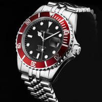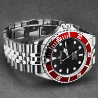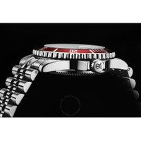 Stainless steel case with a stainless steel bracelet. Uni-directional rotating stainless steel bezel with an inlaid red ring. Black dial with luminous silver-tone hands and dot hour markers. Minute markers around the outer rim. Dial Type: Analog. Luminescent hands and markers. Date display at the 3 o'clock position. Automatic movement with a 38-hour power reserve. Scratch resistant sapphire crystal. Screw down crown. Solid case back. Round case shape. Case size: 42 mm. Case thickness: 12.65 mm. Band width: 22 mm. Band length: 8 inches. Deployment clasp with a push button release. Water resistant at 300 meters / 1000 feet. Functions: date, hour, minute, second. Diver Series. Dive watch style. Watch label: Swiss Made. Revue Thommen Diver Automatic Black Dial Men's Watch 17571.2236. INFORMATION Brand: Revue Thommen Series: Diver Collection Name: Diver Gender: Mens Model: 17571.2236 Watch Label: Swiss Made Movement: Automatic Power Reserve: 38 Hour CASE Case Size: 42 mm Case Thickness: 12.65 mm Case Material: Stainless Steel Case Shape: Round Case Back: Solid BAND Band Material: Stainless Steel Band Type: Bracelet Band Color: Silver-tone Band Length: 8 inches Band Width: 22 mm Clasp: Deployment with Push Button Release DIAL Dial Color: Black Type: Analog Crystal: Scratch Resistant Sapphire Hands: Luminous Silver-tone Dial Markers: Dot Second Markers: Minute Markers around the outer rim Luminiscence: Hands and Markers Bezel: Uni-directional Rotating Bezel Color: Silver-tone Bezel Material: Stainless Steel with an inlaid Red Ring Crown: Screw Down FEATURES Water Resistance: 300 meters / 1000 feet Calendar: Date Display at the 3 o'clock position Functions: Date, Hour, Minute, Second Watch Features: Stainless Steel, Analog ADDITIONAL INFO Watch Style: Dive Warranty: 2 Year Jomashop Warranty Jomashop Sku: Y-173200 Department: Watches Category: Watches