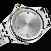 Silver-tone stainless steel case with a two-tone (silver-tone and yellow gold-tone) stainless steel bracelet. Uni-directional rotating black stainless steel bezel. Black dial with yellow gold-tone hands and index hour markers. Minute markers around the outer rim. Dial Type: Analog. Luminescent hands and markers. Date display at the 3 o'clock position. Automatic movement. Scratch resistant sapphire crystal. Screw down crown. Solid case back. Round case shape, case size: 42 mm, case thickness: 12.65 mm. Band width: 22 mm, band length: 8 inches. Deployment with push button release clasp. Water resistant at 300 meters / 1000 feet. Functions: date, hour, minute, second. Diver Series. Dive watch style. Watch label: Swis Made. Revue Thommen Diver Automatic Black Dial Men's Watch 17571.2247. INFORMATION Brand: Revue Thommen Series: Diver Collection Name: Diver Gender: Mens Model: 17571.2247 Watch Label: Swis Made Movement: Automatic CASE Case Size: 42 mm Case Thickness: 12.65 mm Case Material: Stainless Steel Case Shape: Round Case Back: Solid BAND Band Material: Stainless Steel Band Type: Bracelet Band Color: Two-tone (Silver-tone and Yellow Gold-tone) Band Length: 8 inches Band Width: 22 mm Clasp: Deployment with Push Button Release DIAL Dial Color: Black Type: Analog Crystal: Scratch Resistant Sapphire Hands: Yellow Gold-tone Dial Markers: Index Second Markers: Minute Markers around the outer rim Luminiscence: Hands and Markers Bezel: Uni-directional Rotating Bezel Color: Black Bezel Material: Stainless Steel Crown: Screw Down FEATURES Water Resistance: 300 meters / 1000 feet Calendar: Date Display at the 3 o'clock position Functions: Date, Hour, Minute, Second Watch Features: Stainless Steel, Gold, Analog ADDITIONAL INFO Watch Style: Dive Warranty: 2 Year Jomashop Warranty UPC Code: 794504473742 Jomashop Sku: Y-A224C Department: Watches Category: Watches