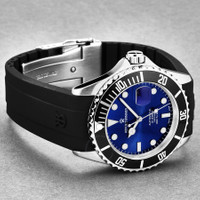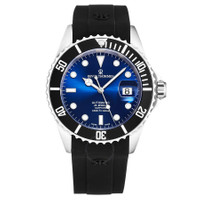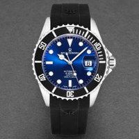 Stainless steel case with a black rubber strap. Uni-directional rotating stainless steel bezel with an inlaid black ring. Blue dial with luminous silver-tone hands and dot hour markers. Minute markers around the outer rim. Dial Type: Analog. Luminescent hands and markers. Date display at the 3 o'clock position. Automatic movement. Scratch resistant sapphire crystal. Screw down crown. Solid case back. Round case shape. Case size: 42 mm. Case thickness: 12.65 mm. Band width: 22 mm. Band length: 8 inches. Deployment clasp with a push button release. Water resistant at 300 meters / 1000 feet. Functions: date, hour, minute, second. Diver Series. Luxury watch style. Watch label: Swiss Made. Revue Thommen Diver Automatic Blue Dial Men's Watch 17571.2823. INFORMATION Brand: Revue Thommen Series: Diver Collection Name: Diver Gender: Mens Model: 17571.2823 Watch Label: Swiss Made Movement: Automatic CASE Case Size: 42 mm Case Thickness: 12.65 mm Case Material: Stainless Steel Case Shape: Round Case Back: Solid BAND Band Material: Rubber Band Type: Strap Band Color: Black Band Length: 8 inches Band Width: 22 mm Clasp: Deployment with Push Button Release DIAL Dial Color: Blue Type: Analog Crystal: Scratch Resistant Sapphire Hands: Luminous Silver-tone Dial Markers: Dot Second Markers: Minute Markers around the outer rim Luminiscence: Hands and Markers Bezel: Uni-directional Rotating Bezel Color: Silver-tone Bezel Material: Stainless Steel with an inlaid Black Ring Crown: Screw Down FEATURES Water Resistance: 300 meters / 1000 feet Calendar: Date display at the 3 o'clock position Functions: Date, Hour, Minute, Second Watch Features: Stainless Steel, Rubber, Analog ADDITIONAL INFO Watch Style: Luxury Warranty: 2 Year Jomashop Warranty UPC Code: 794504461749 Jomashop Sku: Y-146375 Department: Watches Category: Watches