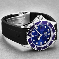 Stainless steel case with a black rubber strap. Uni-directional rotating stainless steel bezel with an inlaid blue ring. Blue dial with luminous silver-tone hands and dot hour markers. Minute markers around the outer rim. Dial Type: Analog. Luminescent hands and markers. Date display at the 3 o'clock position. Automatic movement. Scratch resistant sapphire crystal. Screw down crown. Solid case back. Round case shape. Case size: 42 mm. Case thickness: 12.65 mm. Band width: 22 mm, band length: 8 inches. Fold over clasp with a push button release. Water resistant at 300 meters / 1000 feet. Functions: date, hour, minute, second. Diver Series. Luxury watch style. Watch label: Swiss Made. Revue Thommen Diver Automatic Blue Dial Men's Watch 17571.2828. INFORMATION Brand: Revue Thommen Series: Diver Collection Name: Diver Gender: Mens Model: 17571.2828 Watch Label: Swiss Made Movement: Automatic CASE Case Size: 42 mm Case Thickness: 12.65 mm Case Material: Stainless Steel Case Shape: Round Case Back: Solid BAND Band Material: Rubber Band Type: Strap Band Color: Black Band Length: 8 inches Band Width: 22 mm Clasp: Fold Over with Push Button Release DIAL Dial Color: Blue Type: Analog Crystal: Scratch Resistant Sapphire Hands: Luminous Silver-tone Dial Markers: Dot Second Markers: Minute Markers around the outer rim Luminiscence: Hands and Markers Bezel: Uni-directional Rotating Bezel Color: Silver-tone Bezel Material: Stainless Steel with an inlaid Blue Ring Crown: Screw Down FEATURES Water Resistance: 300 meters / 1000 feet Calendar: Date display at the 3 o'clock position Functions: Date, Hour, Minute, Second Watch Features: Stainless Steel, Rubber, Analog ADDITIONAL INFO Watch Style: Luxury Warranty: 2 Year Jomashop Warranty UPC Code: 794504462241 Jomashop Sku: Y-146372 Department: Watches Category: Watches