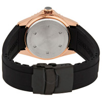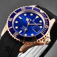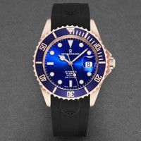 Rose gold-tone stainless steel case with a black rubber strap. Uni-directional rotating rose gold-tone bezel with an inlaid blue metallic ring. Blue dial with luminous rose gold-tone hands and dot hour markers. Minute markers around the outer rim. Dial Type: Analog. Luminescent hands and markers. Date display at the 3 o'clock position. Caliber SW200 automatic movement with a 38hour power reserve. Scratch resistant sapphire crystal. Screw down crown. Solid case back. Round case shape. Case size: 42 mm. Case thickness: 13 mm. Band width: 22 mm. Band length: 8 inches. Fold over clasp with a push button release. Water resistant at 30 meters / 100 feet. Functions: date, hour, minute, second. Diver Series. Luxury watch style. Watch label: Swiss Made. Revue Thommen Diver Automatic Blue Dial Men's Watch 17571.2865. INFORMATION Brand: Revue Thommen Series: Diver Collection Name: Diver Gender: Mens Model: 17571.2865 Watch Label: Swiss Made Movement: Automatic Engine: Caliber SW200 Power Reserve: 38Hour CASE Case Size: 42 mm Case Thickness: 13 mm Case Material: Stainless Steel Case Shape: Round Case Back: Solid BAND Band Material: Rubber Band Type: Strap Band Color: Black Band Length: 8 inches Band Width: 22 mm Clasp: Fold Over with Push Button Release DIAL Dial Color: Blue Type: Analog Crystal: Scratch Resistant Sapphire Hands: Luminous Rose Gold-tone Dial Markers: Dot Second Markers: Minute Markers around the outer rim Luminiscence: Hands and Markers Bezel: Uni-directional Rotating Bezel Color: Rose Gold-tone Bezel Material: Stainless Steel with an inlaib Blue Metallic Ring Crown: Screw Down FEATURES Water Resistance: 30 meters / 100 feet Calendar: Date display at the 3 o'clock position Functions: Date, Hour, Minute, Second Watch Features: Stainless Steel, Rubber, Gold, Analog ADDITIONAL INFO Watch Style: Luxury Warranty: 2 Year Jomashop Warranty Jomashop Sku: Y-149451 Department: Watches Category: Watches