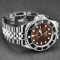 Stainless steel case with a stainless steel bracelet. Uni-directional rotating stainless steel bezel with an inlaid black ring. Brown dial with luminous silver-tone hands and dot hour markers. Minute markers around the outer rim. Dial Type: Analog. Luminescent hands and markers. Date display at the 3 o'clock position. Automatic movement. Scratch resistant sapphire crystal. Screw down crown. Solid case back. Round case shape. Case size: 42 mm. Case thickness: 12.65 mm. Band width: 22 mm. Band length: 8 inches. Deployment clasp with a push button release. Water resistant at 300 meters / 1000 feet. Functions: date, hour, minute, second. Diver Series. Dive watch style. Watch label: Swiss Made. Revue Thommen Diver Automatic Brown Dial Men's Watch 17571.2221. INFORMATION Brand: Revue Thommen Series: Diver Collection Name: Diver Gender: Mens Model: 17571.2221 Watch Label: Swiss Made Movement: Automatic CASE Case Size: 42 mm Case Thickness: 12.65 mm Case Material: Stainless Steel Case Shape: Round Case Back: Solid BAND Band Material: Stainless Steel Band Type: Bracelet Band Color: Silver-tone Band Length: 8 inches Band Width: 22 mm Clasp: Deployment with Push Button Release DIAL Dial Color: Brown Type: Analog Crystal: Scratch Resistant Sapphire Hands: Luminous Silver-tone Dial Markers: Dot Second Markers: Minute Markers around the outer rim Luminiscence: Hands and Markers Bezel: Uni-directional Rotating Bezel Color: Silver-tone Bezel Material: Stainless Steel with an inlaid Black Ring Crown: Screw Down FEATURES Water Resistance: 300 meters / 1000 feet Calendar: Date Display at the 3 o'clock position Functions: Date, Hour, Minute, Second Watch Features: Stainless Steel, Analog ADDITIONAL INFO Watch Style: Dive Warranty: 2 Year Jomashop Warranty Jomashop Sku: Y-173199 Department: Watches Category: Watches