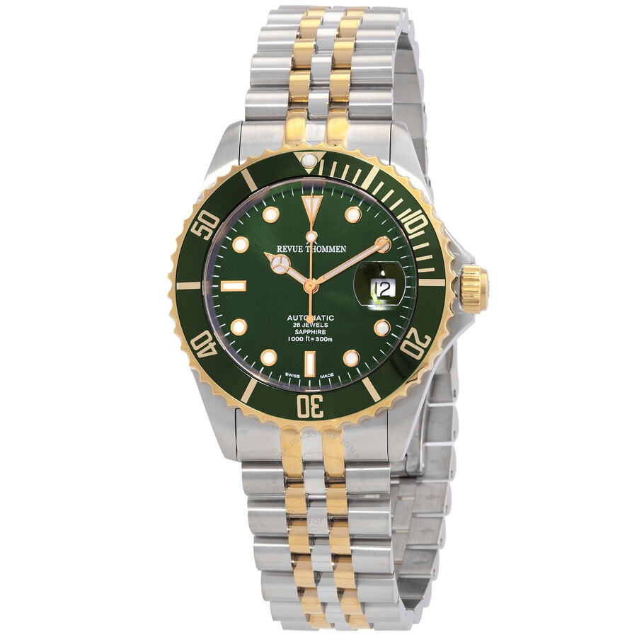 Stainless steel case with a two-tone (silver-tone and yellow gold-tone) stainless steel bracelet. Uni-directional rotating yellow gold-tone bezel with an inlaid green ring. Green dial with luminous yellow gold-tone hands and dot hour markers. Minute markers around the outer rim. Dial Type: Analog. Luminescent hands and markers. Date display at the 3 o'clock position. Automatic movement. Scratch resistant sapphire crystal. Screw down crown. Solid case back. Round case shape. Case size: 42 mm. Case thickness: 12.65 mm. Band width: 22 mm. Band length: 8 inches. Deployment clasp with a push button release. Water resistant at 300 meters / 1000 feet. Functions: date, hour, minute, second. Diver Series. Dive watch style. Watch label: Swis Made. Revue Thommen Diver Automatic Green Dial Men's Watch 17571.2244. INFORMATION Brand: Revue Thommen Series: Diver Collection Name: Diver Gender: Mens Model: 17571.2244 Watch Label: Swis Made Movement: Automatic CASE Case Size: 42 mm Case Thickness: 12.65 mm Case Material: Stainless Steel Case Shape: Round Case Back: Solid BAND Band Material: Stainless Steel Band Type: Bracelet Band Color: Two-tone (Silver-tone and Yellow Gold-tone) Band Length: 8 inches Band Width: 22 mm Clasp: Deployment with Push Button Release DIAL Dial Color: Green Type: Analog Crystal: Scratch Resistant Sapphire Hands: Luminous Yellow Gold-tone Dial Markers: Dot Second Markers: Minute Markers around the outer rim Luminiscence: Hands and Markers Bezel: Uni-directional Rotating Bezel Color: Yellow Gold-tone Bezel Material: Stainless Steel with an inlaid Green Ring Crown: Screw Down FEATURES Water Resistance: 300 meters / 1000 feet Calendar: Date Display at the 3 o'clock position Functions: Date, Hour, Minute, Second Watch Features: Stainless Steel, Gold, Analog ADDITIONAL INFO Watch Style: Dive Warranty: 2 Year Jomashop Warranty UPC Code: 794504473544 Jomashop Sku: Y-A2248 Department: Watches Category: Watches