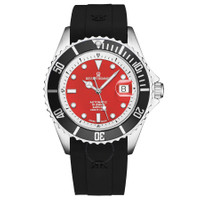 Silver-tone stainless steel case with a black rubber strap. Uni-directional rotating black stainless steel bezel. Red dial with silver-tone hands and index hour markers. Minute markers around the outer rim. Dial Type: Analog. Luminescent hands and markers. Date display at the 3 o'clock position. Sellita Caliber SW200 Automatic movement, containing 26 Jewels, bitting at 28800 vph, and has a power reserve of approximately 38 hours. Scratch resistant sapphire crystal. Screw down crown. Solid case back. Round case shape, case size: 42 mm, case thickness: 13 mm. Band width: 22 mm, band length: 8 inches. Deployment with push button release clasp. Water resistant at 300 meters / 1000 feet. Functions: date, hour, minute, second. Additional Info: hours, minutes, seconds, date. Diver Series. Dive watch style. Watch label: Swiss Made. Revue Thommen Diver Automatic Red Dial Men's Watch 17571.2338. INFORMATION Brand: Revue Thommen Series: Diver Collection Name: Diver Gender: Mens Model: 17571.2338 Watch Label: Swiss Made Movement: Automatic Engine: Sellita Caliber SW200 Power Reserve: 38 hours CASE Case Size: 42 mm Case Thickness: 13 mm Case Material: Stainless Steel Case Shape: Round Case Back: Solid BAND Band Material: Rubber Band Type: Strap Band Color: Black Band Length: 8 inches Band Width: 22 mm Clasp: Deployment with Push Button Release DIAL Dial Color: Red Type: Analog Crystal: Scratch Resistant Sapphire Hands: Silver-tone Dial Markers: Index Second Markers: Minute Markers around the outer rim Luminiscence: Hands and Markers Bezel: Uni-directional Rotating Bezel Color: Black Bezel Material: Stainless Steel Crown: Screw Down FEATURES Water Resistance: 300 meters / 1000 feet Calendar: Date Display at the 3 o'clock position Functions: Date, Hour, Minute, Second Watch Features: Stainless Steel, Rubber, Analog ADDITIONAL INFO Watch Style: Dive Warranty: 2 Year Jomashop Warranty Additional Info: Hours, Minutes, Seconds, Date Jomashop Sku: Y-A2XHD Department: Watches Category: Watches