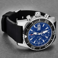 Stainless steel case with a black rubber strap. Uni-directional rotating stainless steel bezel with an inlaid black ring. Blue dial with lumninous silver-tone hands and index hour markers. Minute markers. Tachymeter markings around the outer rim. Dial Type: Analog. Luminescent hands and markers. Day of the week and date display at the 3 o'clock position. Chronograph - three sub-dials displaying: 60 second, 30 minute and 12 hour. ETA-Valjoux caliber 7750 automatic movement, containing 25 Jewels, bitting at 28800 vph, and has a power reserve of approximately 44 hours. Scratch resistant sapphire crystal. Screw down crown. Solid case back. Round case shape. Case size: 45 mm. Case thickness: 16 mm. Band width: 20 mm. Band length: 8 inches. Tang clasp. Water resistant at 300 meters / 1000 feet. Functions: chronograph, tachymeter, day, date, hour, minute, second. Diver Series. Dive watch style. Watch label: Swiss Made. Revue Thommen Diver Chronograph Automatic Blue Dial Men's Watch 17030.6523. INFORMATION Brand: Revue Thommen Series: Diver Collection Name: Diver Gender: Mens Model: 17030.6523 Watch Label: Swiss Made Movement: Automatic Engine: ETA-Valjoux Caliber 7750 Power Reserve: 44 hours CASE Case Size: 45 mm Case Thickness: 16 mm Case Material: Stainless Steel Case Shape: Round Case Back: Solid BAND Band Material: Rubber Band Type: Strap Band Color: Black Band Length: 8 inches Band Width: 20 mm Clasp: Tang DIAL Dial Color: Blue Type: Analog Crystal: Scratch Resistant Sapphire Hands: Lumninous Silver-tone Dial Markers: Index Second Markers: Minute Markers. Tachymeter Markings around the outer rim Sub Dials: Three - 60 Second, 30 Minute and 12 Hour Luminiscence: Hands and Markers Bezel: Uni-directional Rotating Bezel Color: Black Bezel Material: Stainless Steel withan inlaid Black Ring Crown: Screw Down FEATURES Water Resistance: 300 meters / 1000 feet Calendar: Day of the Week and Date display at the 3 o'clock position Functions: Chronograph, Tachymeter, Day, Date, Hour, Minute, Second Watch Features: Chronograph, Stainless Steel, Rubber, Analog ADDITIONAL INFO Watch Style: Dive Warranty: 2 Year Jomashop Warranty Jomashop Sku: Y-106055 Department: Watches Category: Watches