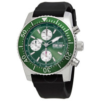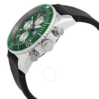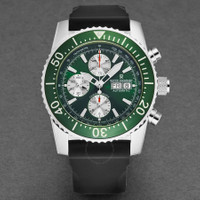 Stainless steel case with a black rubber strap. Uni-directional rotating stainless steel bezel with an inlaid green ring. Green dial with luminous silver-tone hands and index hour markers. Minute markers. Tachymeter markings around the outer rim. Dial Type: Analog. Luminescent hands and markers. Day of the week and date display at the 3 o'clock position. Chronograph - three silver sub-dials displaying: 60 second, 30 minute and 12 hour. ETA-Valjoux caliber 7750 automatic movement, containing 25 Jewels, bitting at 28800 vph, and has a power reserve of approximately 44 hours. Scratch resistant sapphire crystal. Screw down crown. Solid case back. Round case shape. Case size: 45 mm. Case thickness: 16 mm. Band width: 24 mm. Band length: 8 inches. Tang clasp. Water resistant at 300 meters / 1000 feet. Functions: chronograph, tachymeter, day, date, hour, minute, second. Diver Series. Dive watch style. Watch label: Swiss Made. Revue Thommen Diver Chronograph Automatic Green Dial Men's Watch 17030.6531. INFORMATION Brand: Revue Thommen Series: Diver Collection Name: Diver Gender: Mens Model: 17030.6531 Watch Label: Swiss Made Movement: Automatic Engine: ETA-Valjoux Caliber 7750 Power Reserve: 44 hours CASE Case Size: 45 mm Case Thickness: 16 mm Case Material: Stainless Steel Case Shape: Round Case Back: Solid BAND Band Material: Rubber Band Type: Strap Band Color: Black Band Length: 8 inches Band Width: 24 mm Clasp: Tang DIAL Dial Color: Green Type: Analog Crystal: Scratch Resistant Sapphire Hands: Luminous Silver-tone Dial Markers: Index Second Markers: Minute Markers. Tachymeter Markings around the outer rim Sub Dials: Three - 60 Second, 30 Minute and 12 Hour Luminiscence: Hands and Markers Bezel: Uni-directional Rotating Bezel Color: Silver-tone Bezel Material: Stainless Steel with an inlaid Green Ring Crown: Screw Down FEATURES Water Resistance: 300 meters / 1000 feet Calendar: Day of the Week and Date display at the 3 o'clock position Functions: Chronograph, Tachymeter, Day, Date, Hour, Minute, Second Watch Features: Chronograph, Stainless Steel, Rubber, Analog ADDITIONAL INFO Watch Style: Dive Warranty: 2 Year Jomashop Warranty Jomashop Sku: Y-106083 Department: Watches Category: Watches