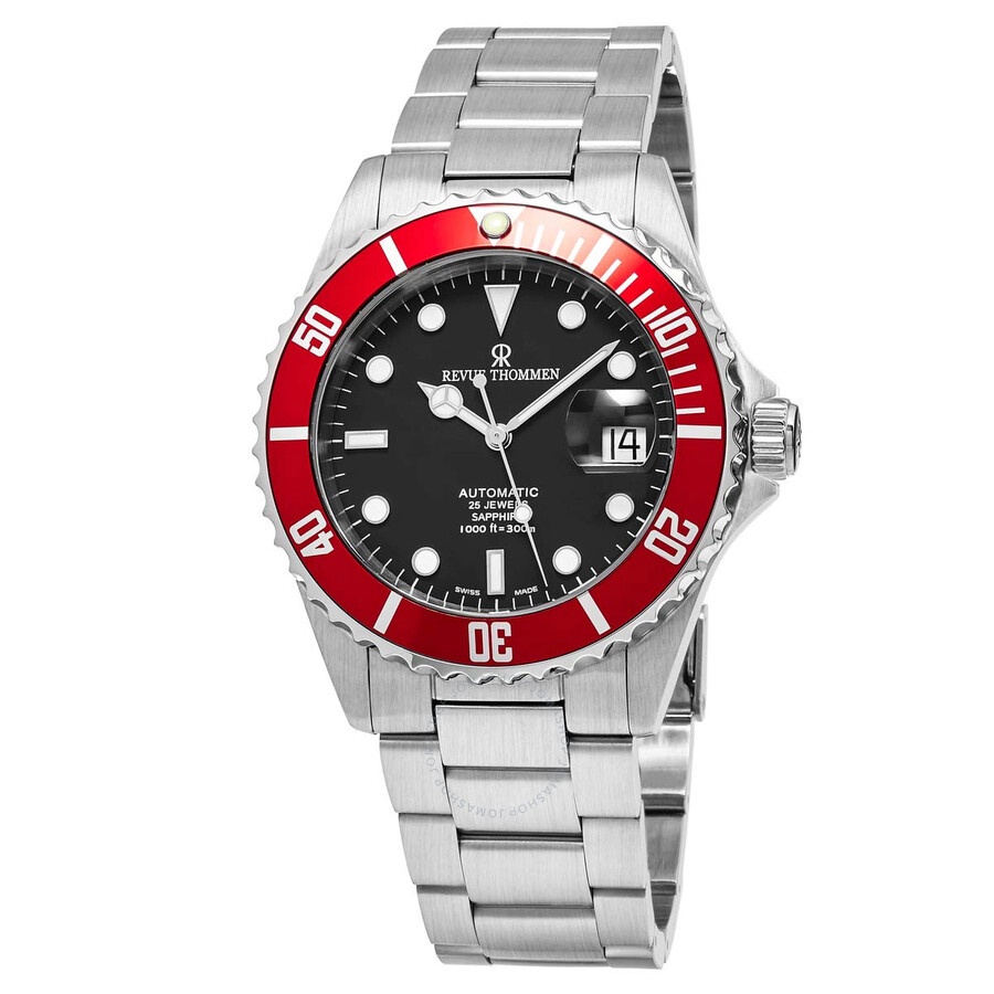 Stainless steel case with a stainless steel bracelet. Uni-directional rotating stainless steel bezel with an inlaid red ring. Black dial with luminous silver-tone hands and dot hour markers. Minute markers around the outer rim. Dial Type: Analog. Luminescent hands and markers. Date display at the 3 o'clock position. Automatic movement. Scratch resistant sapphire crystal. Screw down crown. Solid case back. Round case shape. Case size: 42 mm. Case thickness: 14 mm. Band width: 21.8 mm. Band length: 8 inches. Deployment clasp with a push button release. Water resistant at 300 meters / 1000 feet. Functions: date, hour, minute, second. Diver Xl Series. Sport watch style. Watch label: Swiss Made. Revue Thommen Diver XL Automatic Men's Watch 17571.2136. INFORMATION Brand: Revue Thommen Series: Diver Xl Collection Name: Diver XL Gender: Mens Model: 17571.2136 Watch Label: Swiss Made Movement: Automatic CASE Case Size: 42 mm Case Thickness: 14 mm Case Material: Stainless Steel Case Shape: Round Case Back: Solid BAND Band Material: Stainless Steel Band Type: Bracelet Band Color: Silver-tone Band Length: 8 inches Band Width: 21.8 mm Clasp: Deployment with Push Button Release DIAL Dial Color: black Type: Analog Crystal: Scratch Resistant Sapphire Hands: Luminous Silver-tone Dial Markers: Dot Second Markers: Minute Markers around the outer rim Luminiscence: Hands and Markers Bezel: Uni-directional Rotating Bezel Color: Silver-tone Bezel Material: Stainless Steel with an inlaid Red Ring Crown: Screw Down FEATURES Water Resistance: 300 meters / 1000 feet Calendar: Date display at the 3 o'clock position Functions: Date, Hour, Minute, Second Watch Features: Stainless Steel, Analog ADDITIONAL INFO Watch Style: Sport Warranty: 2 Year Jomashop Warranty Jomashop Sku: RVT-17571-2136 Department: Watches Category: Watches