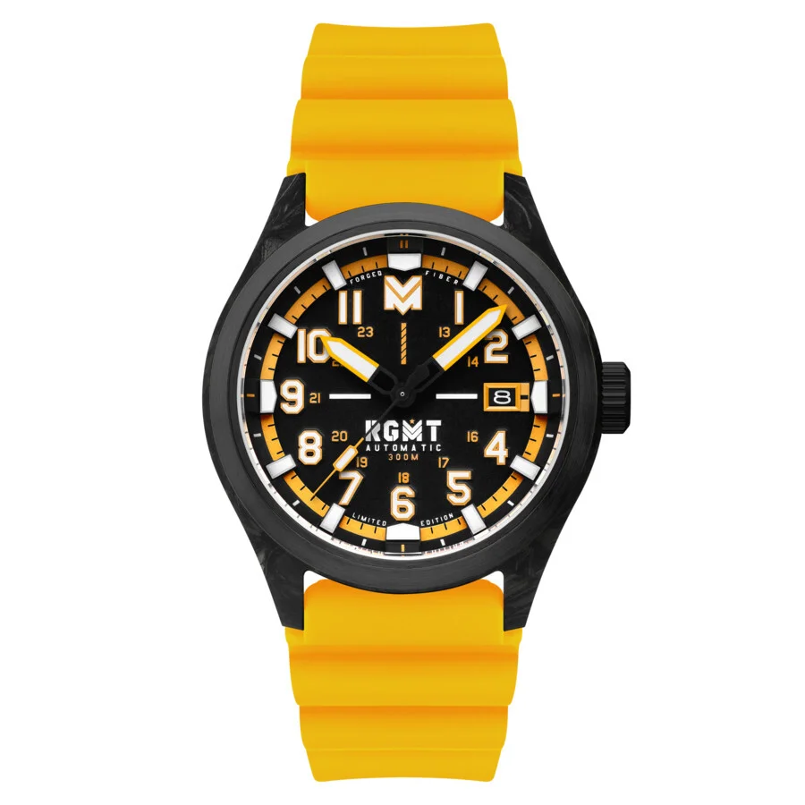 Black composite case with a yellow silicone strap. Fixed black stainless steel bezel. Black dial with black hands and index hour markers. Minute markers around the outer rim. Dial Type: Analog. Luminescent hands and markers. Date display at the 3 o'clock position. SII-NH35 automatic movement. Scratch resistant sapphire crystal. Pull / push crown. Solid case back. Round case shape, case size: 43 mm, case thickness: 13 mm. Band width: 22 mm, band length: 8 inches. Water resistant at 300 meters / 1000 feet. Functions: date, hour, minute, second. Defender Series. Casual watch style. Watch label: Japan Movement. RGMT Defender Automatic Black Dial Men's Watch RG-8069-02. GENERAL Box Type: Original Box CASE Case Diameter: 43 mm Case Thickness: 13 mm Case Material: Composite Case Shape: Round Case Back: Solid BAND Band Material: Silicone Band Type: Strap Band Color: Yellow Band Length: 8 inches Band Width: 22 mm DIAL Dial Color: Black Type: Analog Crystal: Scratch Resistant Sapphire Hands: Black Dial Markers: Index Second Markers: Minute Markers around the outer rim Luminiscence: Hands and Markers Bezel: Fixed Bezel Color: Black Bezel Material: Stainless Steel Crown: Pull / Push INFORMATION Brand: Rgmt Series: Defender Collection Name: Defender Gender: Mens Model: RG-8069-02 Watch Label: Japan Movement Movement: Automatic Engine: SII-NH35 FEATURES Water Resistance: 300 meters / 1000 feet Calendar: Date display at the 3 o'clock position Functions: Date, Hour, Minute, Second Watch Features: Analog, GMT, Stainless Steel ADDITIONAL INFO Watch Style: Casual Warranty: With Manufacturers Guarantee UPC Code: 194595078343 Jomashop Sku: Y-A5MTA Department: Watches