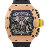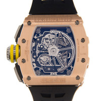 Rose gold-tone 18kt rose gold case with a black rubber strap. Fixed rose gold-tone 18kt rose gold bezel. Transparent dial with rose gold-tone hands and Arabic numeral hour markers. Minute markers around the outer rim. Dial Type: Analog. Luminescent hands and markers. Date display between 4 and 5 o'clock position. Chronograph - three sub-dials displaying: 60 second, 30 minute and 12 hour. Richard Mille Calibre RMAC3 automatic movement with a 55-hour power reserve. Scratch resistant sapphire crystal. Screw down crown. Transparent case back. Tonneau case shape, case size: 49 mm, case thickness: 9 mm. Water resistant at 50 meters / 165 feet. Functions: chronograph, flyback, big date, hour, minute, second, shock resistant. Luxury watch style. Watch label: Swiss Made. Richard Mille Richard Mille 11-03 Chronograph Automatic Men's Watch 11-03 RGTI. GENERAL Box Type: Original Box CASE Case Size: 49 Case Thickness: 9 mm Case Material: 18kt Rose Gold Case Shape: Tonneau Case Back: Transparent BAND Band Material: Rubber Band Type: Strap Band Color: Black DIAL Dial Color: Transparent Type: Analog Crystal: Scratch Resistant Sapphire Hands: Rose Gold-tone Dial Markers: Arabic Numeral Second Markers: Minute Markers around the outer rim Sub Dials: Three - 60 Second, 30 Minute and 12 Hour Luminiscence: Hands and Markers Bezel: Fixed Bezel Color: Rose Gold-tone Bezel Material: 18kt Rose Gold Crown: Screw Down INFORMATION Brand: Richard Mille Series: Richard Mille 11-03 Collection Name: Richard Mille 11-03 Gender: Mens Model: 11-03 RGTI Watch Label: Swiss Made Movement: Automatic Engine: Richard Mille Calibre RMAC3 Power Reserve: 55 hours FEATURES Water Resistance: 50 meters / 165 feet Calendar: Date display between 4 and 5 o'clock position Functions: Chronograph, FlyBack, Big Date, Hour, Minute, Second, Shock Resistant Watch Features: Flyback, Analog, Gold, Rubber, Chronograph ADDITIONAL INFO Watch Style: Luxury Warranty: 2 Year Jomashop Warranty Jomashop Sku: RM-1103RGTI Department: Watches Category: Watches