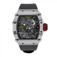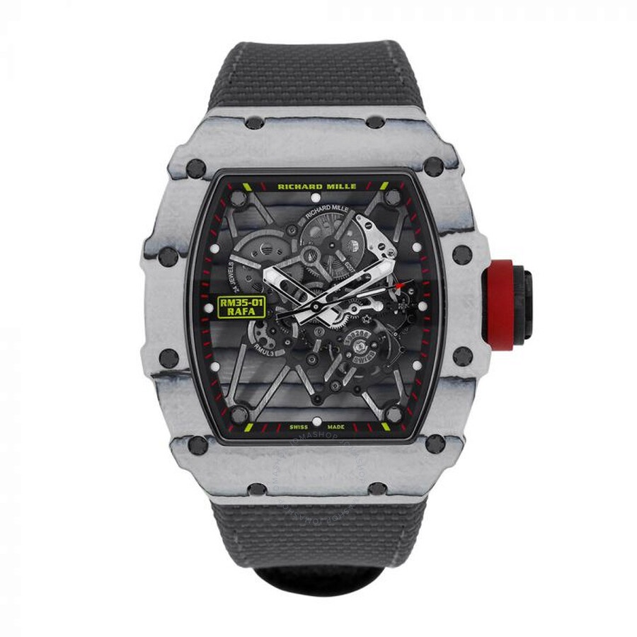 Carbon fiber case with a rubber strap. Fixed carbon fiber bezel. Index hour markers. Minute markers around the outer rim. Dial Type: Analog. Luminescent hands and markers. Automatic movement. Scratch resistant sapphire crystal. Transparent case back. Tonneau case shape, case size: 49.94 x 44.5mm, case thickness: 13.87mm. Deployment clasp. Water resistant at 50 meters / 165 feet. Functions: hour, minute, second. Rm35-01 Series. Luxury watch style. Watch label: Swiss Made. Richard Mille RM35-01 Automatic Men's Watch RM35-01 White NTPT. GENERAL Box Type: Original Box CASE Case Size: 44 Case Thickness: 13.87mm Case Material: Carbon Fiber Case Shape: Tonneau Case Back: Transparent BAND Band Material: Rubber Band Type: Strap Clasp: Deployment DIAL Type: Analog Crystal: Scratch Resistant Sapphire Dial Markers: Index Second Markers: Minute Markers around the outer rim Luminiscence: Hands and Markers Bezel: Fixed Bezel Material: Carbon Fiber INFORMATION Brand: Richard Mille Series: Rm35-01 Collection Name: RM35-01 Gender: Mens Model: RM35-01 White NTPT Watch Label: Swiss Made Movement: Automatic FEATURES Water Resistance: 50 meters / 165 feet Functions: Hour, Minute, Second Watch Features: Analog, Rubber ADDITIONAL INFO Watch Style: Luxury Warranty: 2 Year Jomashop Warranty Jomashop Sku: RM-3501-WTNTPT Department: Watches Category: Watches