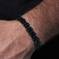 It's all the classic allure of a chain link bracelet, plus a little mystery. This black and blue men's stainless steel bracelet is the next big thing in your collection. The bracelet is 10MM wide, 5MM thick, and 8.5" long to suit most wrists. Robert Alton Men's Bracelets. SKU: TS15677. Barcode: 195091034420. Color: Two-tone. Metal Type: Stainless Steel. Metal Stamp: No Stamp. Gem stone type: None. Bracelet style: Link. Closure type: Jewelry. Robert Alton Black and Blue Men's Stainless Steel Bracelet. GENERAL Color: Two-tone INFORMATION Brand: Robert Alton Gender: Mens Model: TS15677 DETAILS Size Info: 8.5 inches Bracelet Style : Link Closure Type: Jewelry Material : Stainless Steel Metal Stamp: No Stamp ADDITIONAL INFO UPC Code: 195091034420 Jomashop Sku: Y-A4VMX Department: Jewelry Category: Bracelets