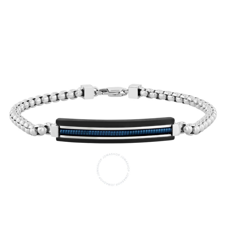 Fusing style and function, this men's stainless steel bracelet features black and blue accents, plus an ID plaque. The bracelet measures 7MM wide, 4.5MM thick, and 8.5" long to comfortably fit most wrists. Robert Alton Men's Bracelets. SKU: TS15593. Barcode: 195091037728. Color: Two-tone. Metal Type: Stainless Steel. Metal Stamp: No Stamp. Gem stone type: None. Bracelet style: Link. Closure type: Lobster. Robert Alton Black and Blue Stainless Steel Men's ID Bracelet. GENERAL Color: Two-tone INFORMATION Brand: Robert Alton Gender: Mens Model: TS15593 DETAILS Size Info: 8.5 inches Bracelet Style : Link Closure Type: Lobster Material : Stainless Steel Metal Stamp: No Stamp ADDITIONAL INFO UPC Code: 195091037728 Jomashop Sku: Y-A4VQD Department: Jewelry Category: Bracelets