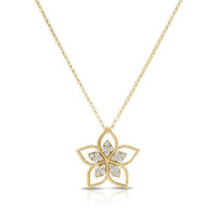 Gemstone Diamond Total Carat Weight 0.20 Diamond Metal Type Gold Gold Weight 18K Metal Color Yellow ROBERTO COIN Ladies Necklaces. SKU: 7773682AY17X. Color: Yellow. Metal Type: Yellow Gold. Metal Stamp: 18k. Gem stone type: Diamond. Necklace style: Pendant. Roberto Coin 18K Gold Vernazza Medium Open Frame Diamond Flower Necklace - 7773682AY17X. GENERAL Box: No Papers: No Color: Yellow INFORMATION Brand: Roberto Coin Gender: Womens Model: 7773682AY17X DETAILS Size Info: 17 inches Necklaces: Pendant Material : Yellow Gold Metal Stamp: 18K Stone Type: Diamond Stone Origin: Natural ADDITIONAL INFO Jomashop Sku: Y-A5DQD Department: Jewelry Category: Necklaces