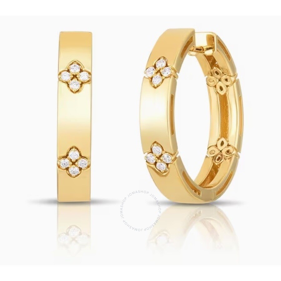 APPROXIMATELY 20MM APPROXIMATELY 0.12 TCW POST WITH HINGE BACK CLOSURE ROBERTO COIN Ladies Earrings. SKU: 8882991AYERX. Color: Yellow. Metal Type: Yellow Gold. Metal Stamp: 18k. Gem stone type: Diamond. Earrings style: 1 Band. Roberto Coin 18k Yellow Gold 0.12cttw Diamond Love in Verona Hoop Earrings - 8882991AYERX. GENERAL Color: Yellow INFORMATION Brand: Roberto Coin Gender: Womens Model: 8882991AYERX DETAILS Earrings: 1 Band Material : Yellow Gold Metal Stamp: 18K Stone Type: Diamond Stone Origin: Natural ADDITIONAL INFO Jomashop Sku: Y-A4UBK Department: Jewelry Category: Earrings