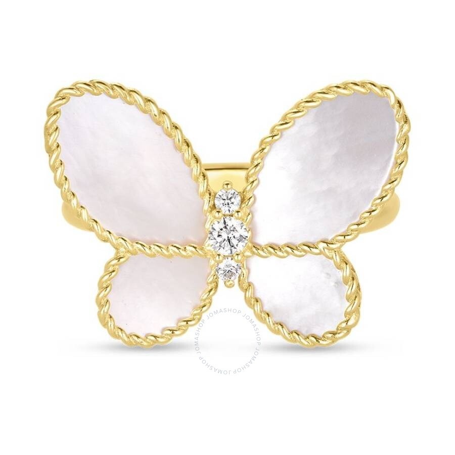 Roberto Coin Ladies Rings. SKU: 7773720AJ65M. Metal Type: Yellow Gold. Roberto Coin 18K Yellow Gold Jasmine Diamond Mother Of Pearl Butterfly Ring. Approximately 0.07 Diamond Tcw. Approximately 1.85 Mother Of Pearl Tcw. GENERAL Box: No Papers: No INFORMATION Brand: Roberto Coin Gender: Womens Model: 7773720AJ65M DETAILS Size Info: 6.5 Ring Size: Ring Size 6.5 Material : Yellow Gold Metal Stamp: 18K Stone Type: Diamond Stone Weight: 0.07 ADDITIONAL INFO Jomashop Sku: Z-37LSP Department: Jewelry Category: Rings