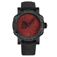 Black stainless steel case with a black rubber strap. Fixed black stainless steel bezel. Red dial with black hands. Dial Type: Analog. Romain Jerome Calibre RJ2901 automatic movement. Scratch resistant sapphire crystal. Pull / push crown. Solid case back. Round case shape, case size: 46 mm, case thickness: 16.5 mm. Band width: 22 mm, band length: 8 inches. Tang clasp. Water resistant at 30 meters / 100 feet. Functions: hour, minute, second. Additional Info: mechanical self-winding movement, 28'800 vph. Moon Dust Series. Luxury watch style. Romain Jerome Moon Dust Automatic Red Dial Men's Watch RJ.MD.AU.701.20. CASE Case Size: 46 Case Thickness: 16.5 mm Case Material: Stainless Steel Case Shape: Round Case Back: Solid BAND Band Material: Rubber Band Type: Strap Band Color: Black Band Length: 8 inches Band Width: 22 mm Clasp: Tang DIAL Dial Color: Red Type: Analog Crystal: Scratch Resistant Sapphire Hands: Black Bezel: Fixed Bezel Color: Black Bezel Material: Stainless Steel Crown: Pull / Push INFORMATION Brand: Romain Jerome Series: Moon Dust Collection Name: Moon Dust Gender: Mens Model: RJ.MD.AU.701.20 Movement: Automatic Engine: Romain Jerome Calibre RJ2901 FEATURES Water Resistance: 30 meters / 100 feet Functions: Hour, Minute, Second Watch Features: Analog, Rubber, Stainless Steel ADDITIONAL INFO Watch Style: Luxury Warranty: 2 Year Jomashop Warranty Additional Info: Mechanical self-winding movement, 28'800 vph Jomashop Sku: Y-A4EMW Department: Watches Category: Watches