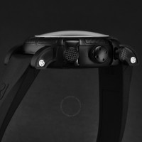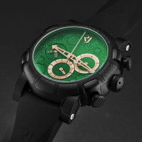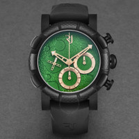 Black stainless steel case with a black rubber strap. Fixed black carbon fiber bezel. Green dial with rose gold-tone hands. Dial Type: Analog. Chronograph - three sub-dials displaying: 60 second, 30 minute and 12 hour. RJ7753 automatic movement. Scratch resistant sapphire crystal. Pull / push crown. Solid case back. Round case shape, case size: 46 mm, case thickness: 17 mm. Band width: 22 mm, band length: 8 inches. Deployment with push button release clasp. Water resistant at 30 meters / 100 feet. Functions: chronograph, hour, minute, second. Moon Dust Series. Luxury watch style. Romain Jerome Moon Dust Chronograph Automatic Green Dial Men's Watch RJ.MD.CH.603.20. GENERAL Box Type: Original Box CASE Case Diameter: 46 Case Thickness: 17 mm Case Material: Stainless Steel Case Shape: Round Case Back: Solid BAND Band Material: Rubber Band Type: Strap Band Color: Black Band Length: 8 inches Band Width: 22 mm Clasp: Deployment with Push Button Release DIAL Dial Color: Green Type: Analog Crystal: Scratch Resistant Sapphire Hands: Rose Gold-tone Sub Dials: Three - 60 Second, 30 Minute and 12 Hour Bezel: Fixed Bezel Color: Black Bezel Material: Carbon Fiber Crown: Pull / Push INFORMATION Brand: Romain Jerome Series: Moon Dust Collection Name: Moon Dust Gender: Mens Model: RJ.MD.CH.603.20 Movement: Automatic Engine: RJ7753 FEATURES Water Resistance: 30 meters / 100 feet Functions: Chronograph, Hour, Minute, Second Watch Features: Analog, Gold, Rubber, Stainless Steel, Chronograph ADDITIONAL INFO Watch Style: Luxury Warranty: 2 Year Jomashop Warranty Jomashop Sku: Y-A55GU Department: Watches