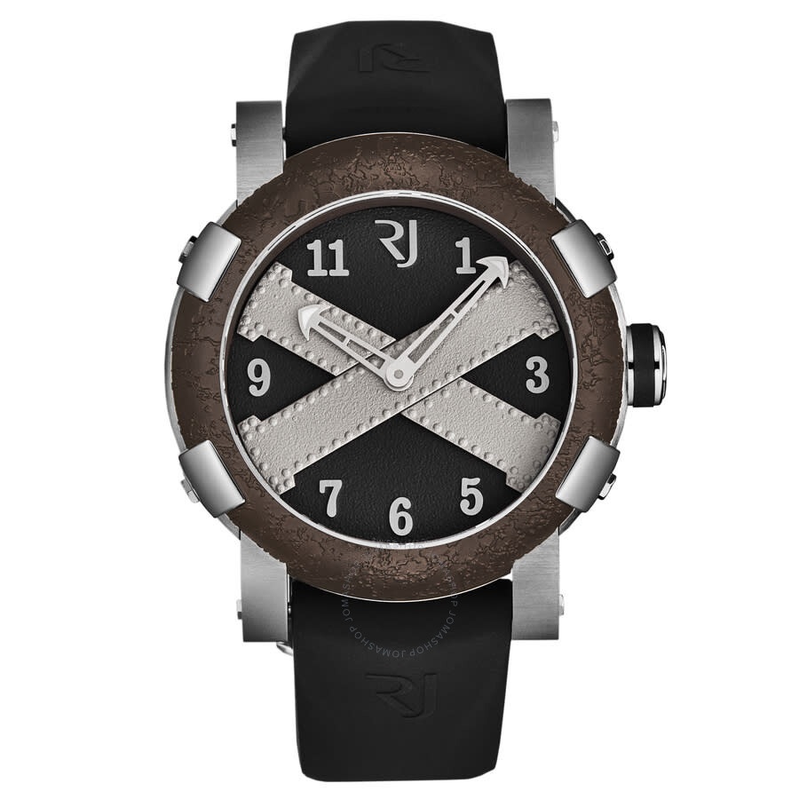 Silver-tone stainless steel case with a black rubber strap. Fixed brown stainless steel bezel. Black dial with silver-tone hands and Arabic numeral hour markers. Dial Type: Analog. Romain Jerome Calibre RJ2001 automatic movement. Scratch resistant sapphire crystal. Pull / push crown. Solid case back. Round case shape, case size: 46 mm, case thickness: 14.5 mm. Band width: 22 mm, band length: 8 inches. Fold over clasp with a safety release. Water resistant at 30 meters / 100 feet. Functions: hour, minute. Additional Info: mechanical self-winding movement - 28,800 vph. Titanic A La Grande Series. Luxury watch style. Romain Jerome Titanic A La Grande Automatic Black Dial Men's Watch RJ.TG.AU.101.10. CASE Case Size: 46 Case Thickness: 14.5 mm Case Material: Stainless Steel Case Shape: Round Case Back: Solid BAND Band Material: Rubber Band Type: Strap Band Color: Black Band Length: 8 inches Band Width: 22 mm Clasp: Fold Over with Safety Release DIAL Dial Color: Black Type: Analog Crystal: Scratch Resistant Sapphire Hands: Silver-tone Dial Markers: Arabic Numeral Bezel: Fixed Bezel Color: Brown Bezel Material: Stainless Steel Crown: Pull / Push INFORMATION Brand: Romain Jerome Series: Titanic A La Grande Collection Name: Titanic A La Grande Gender: Mens Model: RJ.TG.AU.101.10 Movement: Automatic Engine: Romain Jerome Calibre RJ2001 FEATURES Water Resistance: 30 meters / 100 feet Functions: Hour, Minute Watch Features: Analog, Rubber, Stainless Steel ADDITIONAL INFO Watch Style: Luxury Warranty: 2 Year Jomashop Warranty Additional Info: Mechanical self-winding movement - 28,800 vph Jomashop Sku: Y-A3ZZK Department: Watches Category: Watches