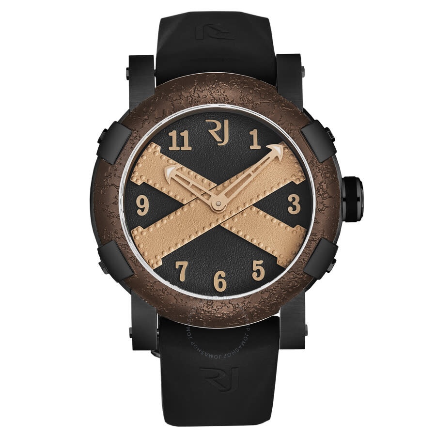 Black stainless steel case with a black rubber strap. Fixed brown stainless steel bezel. Black dial with gold-tone hands and Arabic numeral hour markers. Dial Type: Analog. Luminescent hands. RJ2001 automatic movement. Scratch resistant sapphire crystal. Pull / push crown. Solid case back. Round case shape, case size: 46 mm, case thickness: 14.5 mm. Band width: 22 mm, band length: 8 inches. Tang clasp. Water resistant at 30 meters / 100 feet. Functions: hour, minute. Additional Info: mechanical self-winding movement - 28,800 vph. Titanic A La Grande Series. Luxury watch style. Romain Jerome Titanic A La Grande Automatic Black Dial Men's Watch RJ.TG.AU.103.20. CASE Case Size: 46 Case Thickness: 14.5 mm Case Material: Stainless Steel Case Shape: Round Case Back: Solid BAND Band Material: Rubber Band Type: Strap Band Color: Black Band Length: 8 inches Band Width: 22 mm Clasp: Tang DIAL Dial Color: Black Type: Analog Crystal: Scratch Resistant Sapphire Hands: Gold-tone Dial Markers: Arabic Numeral Luminiscence: Hands Bezel: Fixed Bezel Color: Brown Bezel Material: Stainless Steel Crown: Pull / Push INFORMATION Brand: Romain Jerome Series: Titanic A La Grande Collection Name: Titanic A La Grande Gender: Mens Model: RJ.TG.AU.103.20 Movement: Automatic Engine: RJ2001 FEATURES Water Resistance: 30 meters / 100 feet Functions: Hour, Minute Watch Features: Analog, Gold, Rubber, Stainless Steel ADDITIONAL INFO Watch Style: Luxury Warranty: 2 Year Jomashop Warranty Additional Info: Mechanical self-winding movement - 28,800 vph Jomashop Sku: Y-A48TY Department: Watches Category: Watches