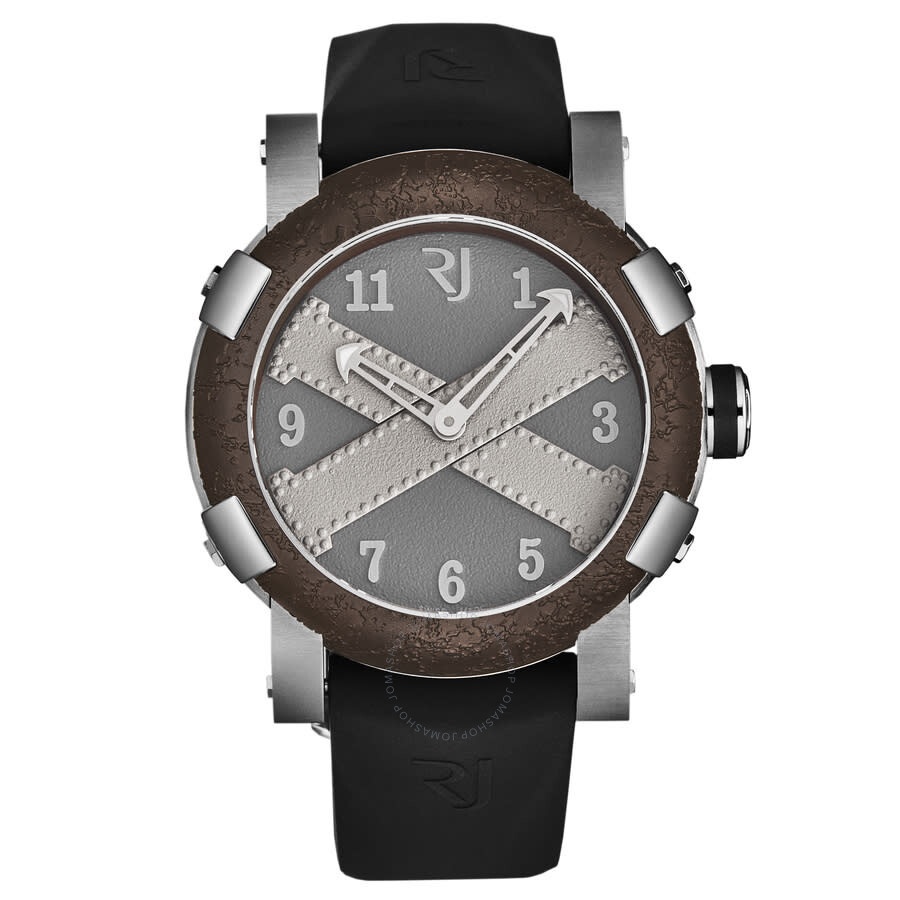 Silver-tone stainless steel case with a black rubber strap. Fixed brown stainless steel bezel. Grey dial with silver-tone hands and Arabic numeral hour markers. Dial Type: Analog. Romain Jerome Calibre RJ2001 automatic movement. Scratch resistant sapphire crystal. Pull / push crown. Solid case back. Round case shape, case size: 46 mm, case thickness: 14.5 mm. Band width: 22 mm, band length: 8 inches. Fold over clasp with a safety release. Water resistant at 30 meters / 100 feet. Functions: hour, minute. Additional Info: hours, minutes. Titanic A La Grande Series. Luxury watch style. Watch label: Swiss Made. Romain Jerome Titanic A La Grande Automatic Grey Dial Men's Watch RJ.TG.AU.401.10. CASE Case Size: 46 Case Thickness: 14.5 mm Case Material: Stainless Steel Case Shape: Round Case Back: Solid BAND Band Material: Rubber Band Type: Strap Band Color: Black Band Length: 8 inches Band Width: 22 mm Clasp: Fold Over with Safety Release DIAL Dial Color: Grey Type: Analog Crystal: Scratch Resistant Sapphire Hands: Silver-tone Dial Markers: Arabic Numeral Bezel: Fixed Bezel Color: Brown Bezel Material: Stainless Steel Crown: Pull / Push INFORMATION Brand: Romain Jerome Series: Titanic A La Grande Collection Name: Titanic A La Grande Gender: Mens Model: RJ.TG.AU.401.10 Watch Label: Swiss Made Movement: Automatic Engine: Romain Jerome Calibre RJ2001 FEATURES Water Resistance: 30 meters / 100 feet Functions: Hour, Minute Watch Features: Analog, Rubber, Stainless Steel ADDITIONAL INFO Watch Style: Luxury Warranty: 2 Year Jomashop Warranty Additional Info: Hours, Minutes Jomashop Sku: Y-A4BM7 Department: Watches Category: Watches