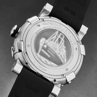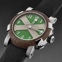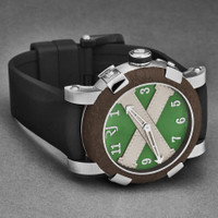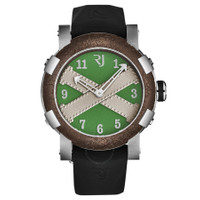 Silver-tone stainless steel case with a black rubber strap. Fixed brown stainless steel bezel. Green dial with silver-tone hands and Arabic numeral hour markers. Dial Type: Analog. RJ2001 - Mechanical self-winding movement - 28,800 vph automatic movement. Scratch resistant sapphire crystal. Pull / push crown. Solid case back. Round case shape, case size: 46 mm, case thickness: 14.5 mm. Band width: 22 mm, band length: 8 inches. Tang clasp. Water resistant at 30 meters / 100 feet. Functions: hour, minute. Additional Info: hours, minutes. Titanic A La Grande Series. Luxury watch style. Romain Jerome Titanic A La Grande Green Dial Men's Watch RJ.TG.AU.601.10. CASE Case Size: 46 Case Thickness: 14.5 mm Case Material: Stainless Steel Case Shape: Round Case Back: Solid BAND Band Material: Rubber Band Type: Strap Band Color: Black Band Length: 8 inches Band Width: 22 mm Clasp: Tang DIAL Dial Color: Green Type: Analog Crystal: Scratch Resistant Sapphire Hands: Silver-tone Dial Markers: Arabic Numeral Bezel: Fixed Bezel Color: Brown Bezel Material: Stainless Steel Crown: Pull / Push INFORMATION Brand: Romain Jerome Series: Titanic A La Grande Collection Name: Titanic A La Grande Gender: Mens Model: RJ.TG.AU.601.10 Movement: Automatic Engine: RJ2001 - Mechanical self-winding movement - 28,800 vph FEATURES Water Resistance: 30 meters / 100 feet Functions: Hour, Minute Watch Features: Analog, Rubber, Stainless Steel ADDITIONAL INFO Watch Style: Luxury Warranty: 2 Year Jomashop Warranty Additional Info: Hours, Minutes Jomashop Sku: Y-A4DGW Department: Watches Category: Watches