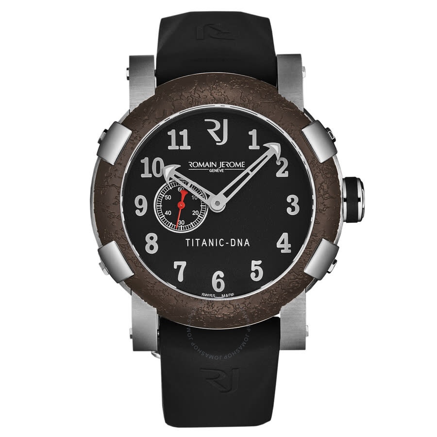 Silver-tone stainless steel case with a black rubber strap. Fixed brown bezel. Black dial with silver-tone hands and Arabic numeral hour markers. Dial Type: Analog. Luminescent hands and markers. Romain Jerome calibre C22RJ51 automatic movement. Scratch resistant sapphire crystal. Pull / push crown. Solid case back. Round case shape, case size: 46 mm, case thickness: 14.5 mm. Band width: 22 mm, band length: 8 inches. Deployment with push button release clasp. Water resistant at 30 meters / 100 feet. Functions: hour, minute, second. Additional Info: hours, minutes, small seconds. Titanic Series. Luxury watch style. Watch label: Swiss Made. Romain Jerome Titanic Automatic Black Dial Men's Watch RJ.TI.AU.101.10. CASE Case Size: 46 Case Thickness: 14.5 mm Case Material: Stainless Steel Case Shape: Round Case Back: Solid BAND Band Material: Rubber Band Type: Strap Band Color: Black Band Length: 8 inches Band Width: 22 mm Clasp: Deployment with Push Button Release DIAL Dial Color: Black Type: Analog Crystal: Scratch Resistant Sapphire Hands: Silver-tone Dial Markers: Arabic Numeral Luminiscence: Hands and Markers Bezel: Fixed Bezel Color: Brown Crown: Pull / Push INFORMATION Brand: Romain Jerome Series: Titanic Collection Name: Titanic Gender: Mens Model: RJ.TI.AU.101.10 Watch Label: Swiss Made Movement: Automatic Engine: Romain Jerome calibre C22RJ51 FEATURES Water Resistance: 30 meters / 100 feet Functions: Hour, Minute, Second Watch Features: Analog, Rubber, Stainless Steel ADDITIONAL INFO Watch Style: Luxury Warranty: 2 Year Jomashop Warranty Additional Info: Hours, Minutes, Small Seconds Jomashop Sku: Y-A3Y53 Department: Watches Category: Watches