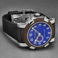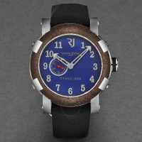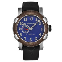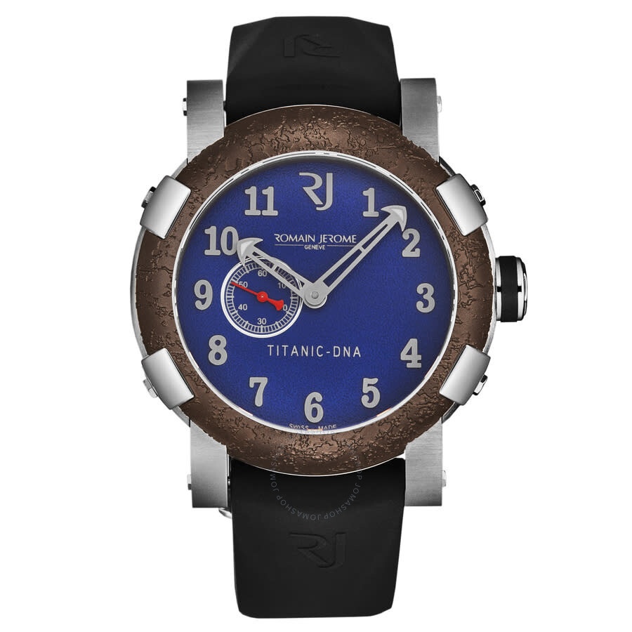 Silver-tone stainless steel case with a black rubber strap. Fixed brown stainless steel bezel. Blue dial with silver-tone hands and Arabic numeral hour markers. Dial Type: Analog. Luminescent hands. Romain Jerome Calibre RJ2901 automatic movement. Scratch resistant sapphire crystal. Pull / push crown. Solid case back. Round case shape, case size: 46 mm, case thickness: 14.5 mm. Band width: 22 mm, band length: 8 inches. Deployment with push button release clasp. Water resistant at 30 meters / 100 feet. Functions: hour, minute, second. Additional Info: mechanical self-winding movement, 28'800 vph. Titanic Series. Luxury watch style. Romain Jerome Titanic Automatic Blue Dial Men's Watch RJTIAU.501.10. CASE Case Size: 46 Case Thickness: 14.5 mm Case Material: Stainless Steel Case Shape: Round Case Back: Solid BAND Band Material: Rubber Band Type: Strap Band Color: Black Band Length: 8 inches Band Width: 22 mm Clasp: Deployment with Push Button Release DIAL Dial Color: Blue Type: Analog Crystal: Scratch Resistant Sapphire Hands: Silver-tone Dial Markers: Arabic Numeral Luminiscence: Hands Bezel: Fixed Bezel Color: Brown Bezel Material: Stainless Steel Crown: Pull / Push INFORMATION Brand: Romain Jerome Series: Titanic Collection Name: Titanic Gender: Mens Model: RJTIAU.501.10 Movement: Automatic Engine: Romain Jerome Calibre RJ2901 FEATURES Water Resistance: 30 meters / 100 feet Functions: Hour, Minute, Second Watch Features: Analog, Rubber, Stainless Steel ADDITIONAL INFO Watch Style: Luxury Warranty: 2 Year Jomashop Warranty Additional Info: Mechanical self-winding movement, 28'800 vph Jomashop Sku: Y-A44U3 Department: Watches Category: Watches
