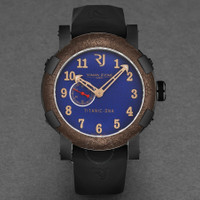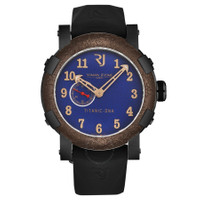 Black stainless steel case with a black rubber strap. Fixed brown stainless steel bezel. Blue dial with rose gold-tone hands and Arabic numeral hour markers. Dial Type: Analog. Romain Jerome Calibre RJ2901 automatic movement. Scratch resistant sapphire crystal. Pull / push crown. Solid case back. Round case shape, case size: 46 mm, case thickness: 15 mm. Band width: 22 mm, band length: 8 inches. Deployment with push button release clasp. Water resistant at 30 meters / 100 feet. Functions: hour, minute, second. Additional Info: mechanical self-winding movement, 28'800 vph. Titanic Series. Luxury watch style. Watch label: Swiss Made. Romain Jerome Titanic Automatic Blue Dial Men's Watch RJTIAU.503.20. CASE Case Size: 46 Case Thickness: 15 mm Case Material: Stainless Steel Case Shape: Round Case Back: Solid BAND Band Material: Rubber Band Type: Strap Band Color: Black Band Length: 8 inches Band Width: 22 mm Clasp: Deployment with Push Button Release DIAL Dial Color: Blue Type: Analog Crystal: Scratch Resistant Sapphire Hands: Rose Gold-tone Dial Markers: Arabic Numeral Bezel: Fixed Bezel Color: Brown Bezel Material: Stainless Steel Crown: Pull / Push INFORMATION Brand: Romain Jerome Series: Titanic Collection Name: Titanic Gender: Mens Model: RJTIAU.503.20 Watch Label: Swiss Made Movement: Automatic Engine: Romain Jerome Calibre RJ2901 FEATURES Water Resistance: 30 meters / 100 feet Functions: Hour, Minute, Second Watch Features: Analog, Gold, Rubber, Stainless Steel ADDITIONAL INFO Watch Style: Luxury Warranty: 2 Year Jomashop Warranty Additional Info: Mechanical self-winding movement, 28'800 vph Jomashop Sku: Y-A43WH Department: Watches Category: Watches
