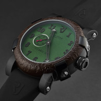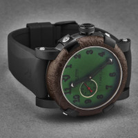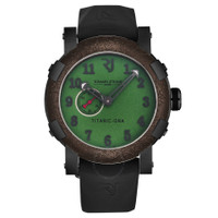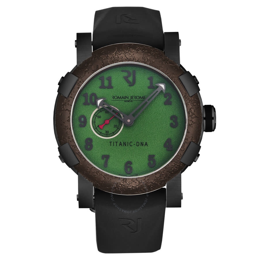Black stainless steel case with a black rubber strap. Fixed brown stainless steel bezel. Green dial with black hands and Arabic numeral hour markers. Dial Type: Analog. Luminescent hands. RJ2901 automatic movement. Scratch resistant sapphire crystal. Pull / push crown. Solid case back. Round case shape, case size: 46 mm, case thickness: 14.5 mm. Band width: 22 mm, band length: 8 inches. Tang clasp. Water resistant at 30 meters / 100 feet. Functions: hour, minute, second. Additional Info: mechanical self-winding movement, 28'800 vph. Titanic Series. Luxury watch style. Watch label: Swiss Made. Romain Jerome Titanic Automatic Green Dial Men's Watch RJ.TI.AU.602.20. CASE Case Size: 46 Case Thickness: 14.5 mm Case Material: Stainless Steel Case Shape: Round Case Back: Solid BAND Band Material: Rubber Band Type: Strap Band Color: Black Band Length: 8 inches Band Width: 22 mm Clasp: Tang DIAL Dial Color: Green Type: Analog Crystal: Scratch Resistant Sapphire Hands: Black Dial Markers: Arabic Numeral Luminiscence: Hands Bezel: Fixed Bezel Color: Brown Bezel Material: Stainless Steel Crown: Pull / Push INFORMATION Brand: Romain Jerome Series: Titanic Collection Name: Titanic Gender: Mens Model: RJ.TI.AU.602.20 Watch Label: Swiss Made Movement: Automatic Engine: RJ2901 FEATURES Water Resistance: 30 meters / 100 feet Functions: Hour, Minute, Second Watch Features: Analog, Rubber, Stainless Steel ADDITIONAL INFO Watch Style: Luxury Warranty: 2 Year Jomashop Warranty Additional Info: Mechanical self-winding movement, 28'800 vph Jomashop Sku: Y-A4F59 Department: Watches Category: Watches