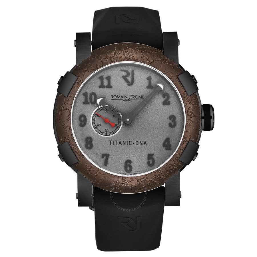 Black stainless steel case with a black rubber strap. Fixed brown stainless steel bezel. Grey dial with black hands and Arabic numeral hour markers. Dial Type: Analog. Luminescent hands. Romain Jerome Calibre RJ2901 automatic movement. Scratch resistant sapphire crystal. Pull / push crown. Solid case back. Round case shape, case size: 46 mm, case thickness: 15 mm. Band width: 22 mm, band length: 8 inches. Deployment with push button release clasp. Water resistant at 30 meters / 100 feet. Functions: hour, minute, second. Additional Info: mechanical self-winding movement, 28'800 vph. Titanic Series. Luxury watch style. Romain Jerome Titanic Automatic Grey Dial Men's Watch RJTIAU.402.20. CASE Case Size: 46 Case Thickness: 15 mm Case Material: Stainless Steel Case Shape: Round Case Back: Solid BAND Band Material: Rubber Band Type: Strap Band Color: Black Band Length: 8 inches Band Width: 22 mm Clasp: Deployment with Push Button Release DIAL Dial Color: Grey Type: Analog Crystal: Scratch Resistant Sapphire Hands: Black Dial Markers: Arabic Numeral Luminiscence: Hands Bezel: Fixed Bezel Color: Brown Bezel Material: Stainless Steel Crown: Pull / Push INFORMATION Brand: Romain Jerome Series: Titanic Collection Name: Titanic Gender: Mens Model: RJTIAU.402.20 Movement: Automatic Engine: Romain Jerome Calibre RJ2901 FEATURES Water Resistance: 30 meters / 100 feet Functions: Hour, Minute, Second Watch Features: Analog, Rubber, Stainless Steel ADDITIONAL INFO Watch Style: Luxury Warranty: 2 Year Jomashop Warranty Additional Info: Mechanical self-winding movement, 28'800 vph Jomashop Sku: Y-A44TZ Department: Watches Category: Watches