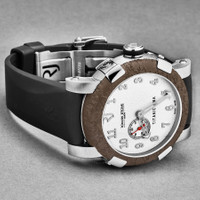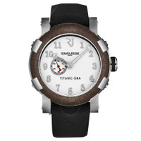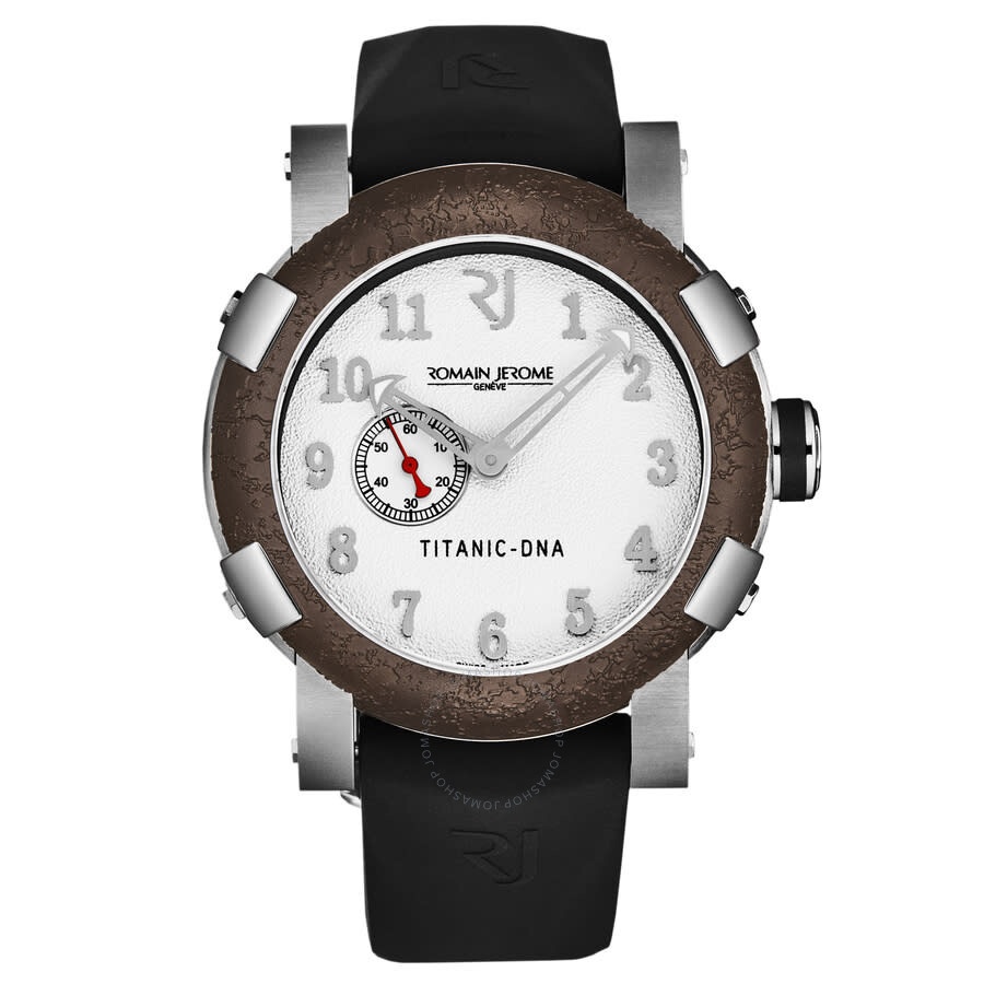 Silver-tone stainless steel case with a black rubber strap. Fixed brown stainless steel bezel. White dial with silver-tone hands and Arabic numeral hour markers. Dial Type: Analog. Luminescent hands. Romain Jerome Calibre RJ2901 automatic movement. Scratch resistant sapphire crystal. Pull / push crown. Solid case back. Round case shape, case size: 46 mm, case thickness: 14.5 mm. Band width: 22 mm, band length: 8 inches. Deployment with push button release clasp. Water resistant at 30 meters / 100 feet. Functions: hour, minute, second. Additional Info: mechanical self-winding movement, 28'800 vph. Titanic Series. Luxury watch style. Romain Jerome Titanic Automatic White Dial Men's Watch RJTIAU.201.10. CASE Case Size: 46 Case Thickness: 14.5 mm Case Material: Stainless Steel Case Shape: Round Case Back: Solid BAND Band Material: Rubber Band Type: Strap Band Color: Black Band Length: 8 inches Band Width: 22 mm Clasp: Deployment with Push Button Release DIAL Dial Color: White Type: Analog Crystal: Scratch Resistant Sapphire Hands: Silver-tone Dial Markers: Arabic Numeral Luminiscence: Hands Bezel: Fixed Bezel Color: Brown Bezel Material: Stainless Steel Crown: Pull / Push INFORMATION Brand: Romain Jerome Series: Titanic Collection Name: Titanic Gender: Mens Model: RJTIAU.201.10 Movement: Automatic Engine: Romain Jerome Calibre RJ2901 FEATURES Water Resistance: 30 meters / 100 feet Functions: Hour, Minute, Second Watch Features: Analog, Rubber, Stainless Steel ADDITIONAL INFO Watch Style: Luxury Warranty: 2 Year Jomashop Warranty Additional Info: Mechanical self-winding movement, 28'800 vph Jomashop Sku: Y-A44U4 Department: Watches Category: Watches