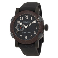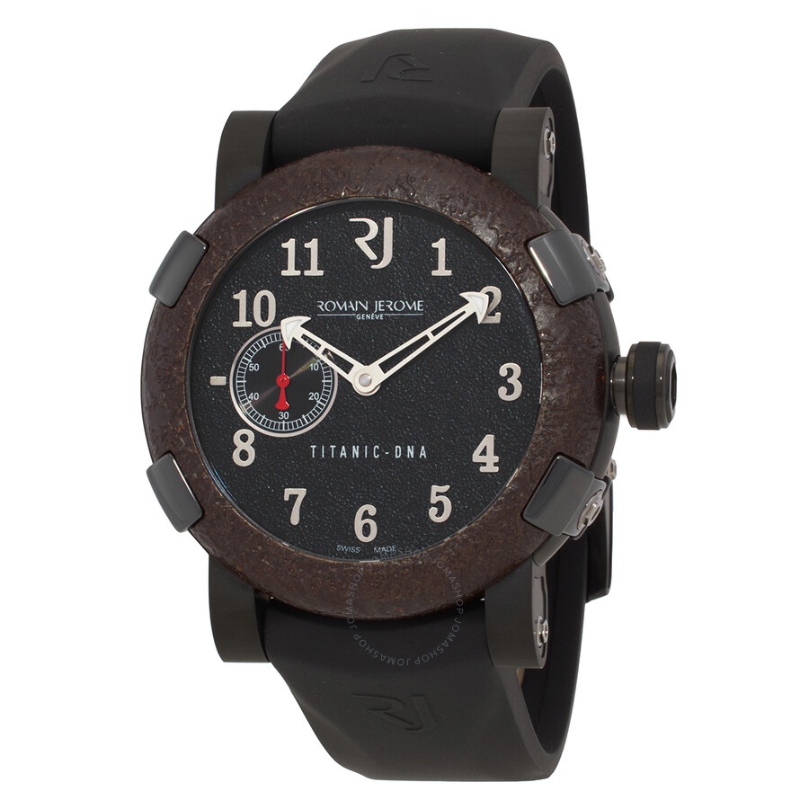 Black stainless steel case with a black rubber strap. Fixed brown stainless steel bezel. Black dial with silver-tone hands and Arabic numeral hour markers. Dial Type: Analog. Automatic Romain Jerome calibre C22RJ51 28,800 vph automatic movement. Scratch resistant sapphire crystal. Screw down crown. Solid case back. Round case shape, case size: 46 mm, case thickness: 14.5 mm. Band width: 22 mm, band length: 8 inches. Tang clasp. Water resistant at 30 meters / 100 feet. Functions: hour, minute, second. Additional Info: hours, minutes, small seconds. Titanic Series. Luxury watch style. Watch label: Swiss Made. Romain Jerome Titanic Black Dial Men's Watch RJ.TI.AU.101.20. INFORMATION Brand: Romain Jerome Series: Titanic Collection Name: Titanic Gender: Mens Model: RJ.TI.AU.101.20 Watch Label: Swiss Made Movement: Automatic Engine: Automatic Romain Jerome calibre C22RJ51 28,800 vph CASE Case Size: 46 mm Case Thickness: 14.5 mm Case Material: Stainless Steel Case Shape: Round Case Back: Solid BAND Band Material: Rubber Band Type: Strap Band Color: Black Band Length: 8 inches Band Width: 22 mm Clasp: Tang DIAL Dial Color: Black Type: Analog Crystal: Scratch Resistant Sapphire Hands: Silver-tone Dial Markers: Arabic Numeral Bezel: Fixed Bezel Color: Brown Bezel Material: Stainless Steel Crown: Screw Down FEATURES Water Resistance: 30 meters / 100 feet Functions: Hour, Minute, Second Watch Features: Stainless Steel, Rubber, Analog ADDITIONAL INFO Watch Style: Luxury Warranty: 2 Year Jomashop Warranty Additional Info: Hours, Minutes, Small Seconds Jomashop Sku: Y-A3AV8 Department: Watches Category: Watches