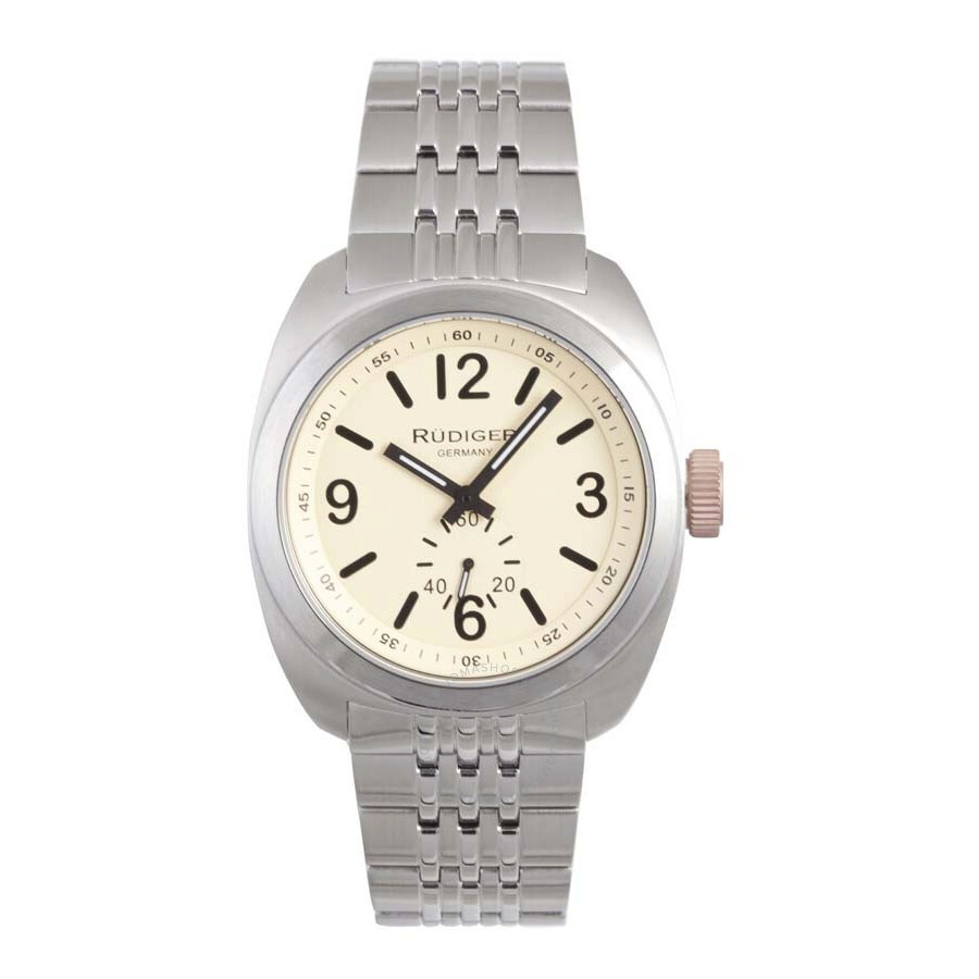 Silver-tone stainless steel case with a silver stainless steel bracelet. Fixed silver-tone stainless steel bezel. with black hands and index and Arabic numeral hour markers. Minute markers around the outer rim. Dial Type: Analog. One - 60 seconds subdial. Quartz movement. Scratch resistant mineral crystal. Push/pull crown. Solid case back. Round case shape, case size: 44 mm, case thickness: 11 mm. Band width: 23 mm, band length: 8.5 in. Deployant buckle clasp. Water resistant at 100 meters / 330 feet. Functions: hour, minute, second. Casual watch style. Rudiger Siegen Men's Watch R5001-04-013.7. CASE Case Size: 44 Case Thickness: 11 mm Case Material: Stainless steel Case Shape: Round Case Back: Solid BAND Band Material: Stainless Steel Band Type: Bracelet Band Color: Silver-tone Band Length: 8.5 inches Band Width: 23 mm Clasp: Deployant Buckle DIAL Type: Analog Crystal: Scratch Resistant Mineral Hands: Black Dial Markers: Index and Arabic Numeral Sub Dials: One - Small Second Bezel: Fixed Bezel Color: Silver-tone Bezel Material: Stainless steel Crown: Push/pull INFORMATION Brand: Rudiger Series: Siegen Collection Name: Siegen Gender: Mens Model: R5001-04-013.7 Movement: Quartz FEATURES Water Resistance: 100 Meters / 330 feet Functions: Hour, Minute, Second Watch Features: Stainless Steel, Analog ADDITIONAL INFO Watch Style: Casual Warranty: With Manufacturers Guarantee UPC Code: 846341067827 Jomashop Sku: Z-YHLZ2 Department: Watches