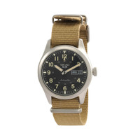 Stainless steel case with a khaki nylon strap. Fixed stainless steel bezel. Black dial with luyminous silver-tone hands and Arabic numeral hour markers. 24 hour markers. Minute markers around the outer rim. Dial Type: Analog. Luminescent hands and markers. Day of the week and date display at the 3 o'clock position. Seiko caliber 4R36 automatic movement, containing 24 Jewels, bitting at 21600 vph, and has a power reserve of approximately 41 hours. Scratch resistant Hardlex crystal. Pull / push crown. Transparent case back. Round case shape. Case size: 39.4 mm. Case thickness: 13.2 mm. Band width: 20 mm. Tang clasp. Water resistant at 100 meters / 330 feet. Functions: date, hour, minute, second. 5 Sports Series. Sport watch style. Watch label: Japan Movt. Seiko 5 Sports Automatic Black Dial Men's Watch SRPG35K1. GENERAL Box Type: Original Box CASE Case Size: 39 Case Thickness: 13.2 mm Case Material: Stainless Steel Case Shape: Round Case Back: Transparent BAND Band Material: Nylon Band Type: Strap Band Color: Khaki Band Width: 20 mm Clasp: Tang DIAL Dial Color: Black Type: Analog Crystal: Scratch Resistant Hardlex Hands: Luyminous Silver-tone Dial Markers: Arabic Numeral Second Markers: 24 Hour Markers. Minute Markers around the outer rim Luminiscence: Hands and Markers Bezel: Fixed Bezel Color: Silver-tone Bezel Material: Stainless Steel Crown: Pull / Push INFORMATION Brand: Seiko Series: 5 Sports Collection Name: 5 Sports Gender: Mens Model: SRPG35K1 Watch Label: Japan Movt Movement: Automatic Engine: Seiko Caliber 4R36 Power Reserve: 41 hours FEATURES Water Resistance: 100 meters / 330 feet Calendar: Day of the Week and Date display at the 3 o'clock position Functions: Date, Hour, Minute, Second Watch Features: Analog, Stainless Steel ADDITIONAL INFO Watch Style: Sport Warranty: 3 Year Jomashop Warranty UPC Code: 4954628240552 Jomashop Sku: SE-SRPG35K1 Item Variation: SRPG35 Department: Watches Category: Watches