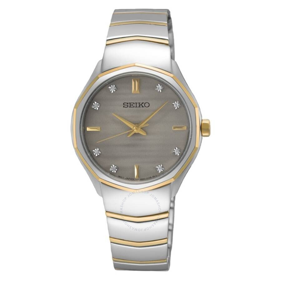 Silver-tone stainless steel case with a two-tone (silver-tone and rose gold-tone) stainless steel bracelet. Fixed stainless steel bezel. Grey dial with gold-tone hands and crystal-index hour markers. Dial Type: Analog. Seiko Caliber 6N01 quartz movement. Scratch resistant sapphire crystal. Pull / push crown. Solid case back. Round case shape, case size: 29.6 mm. Fold over clasp with a safety release. Water resistant at 50 meters / 165 feet. Functions: hour, minute, second. Casual watch style. Watch label: Japan Movt. Seiko Quartz Crystal Grey Dial Ladies Watch SUR616P1. GENERAL Box Type: Original Box CASE Case Material: Stainless Steel Case Shape: Round Case Back: Solid BAND Band Material: Stainless Steel Band Type: Bracelet Band Color: Two-tone (Silver-tone and Rose Gold-tone) Clasp: Fold Over with Safety Release DIAL Dial Color: Grey Type: Analog Crystal: Scratch Resistant Sapphire Hands: Gold-tone Dial Markers: Crystal-Index Bezel: Fixed Bezel Material: Stainless Steel Crown: Pull / Push INFORMATION Brand: Seiko Series: Classic Fusion Collection Name: Classic Gender: Womens Model: SUR616P1 Watch Label: Japan Movt Movement: Quartz Engine: Seiko Caliber 6N01 FEATURES Water Resistance: 50 meters / 165 feet Functions: Hour, Minute, Second Watch Features: Analog, Gold, Stainless Steel ADDITIONAL INFO Watch Style: Casual Warranty: 3 Year Jomashop Warranty Jomashop Sku: SE-SUR616P1 Department: Watches