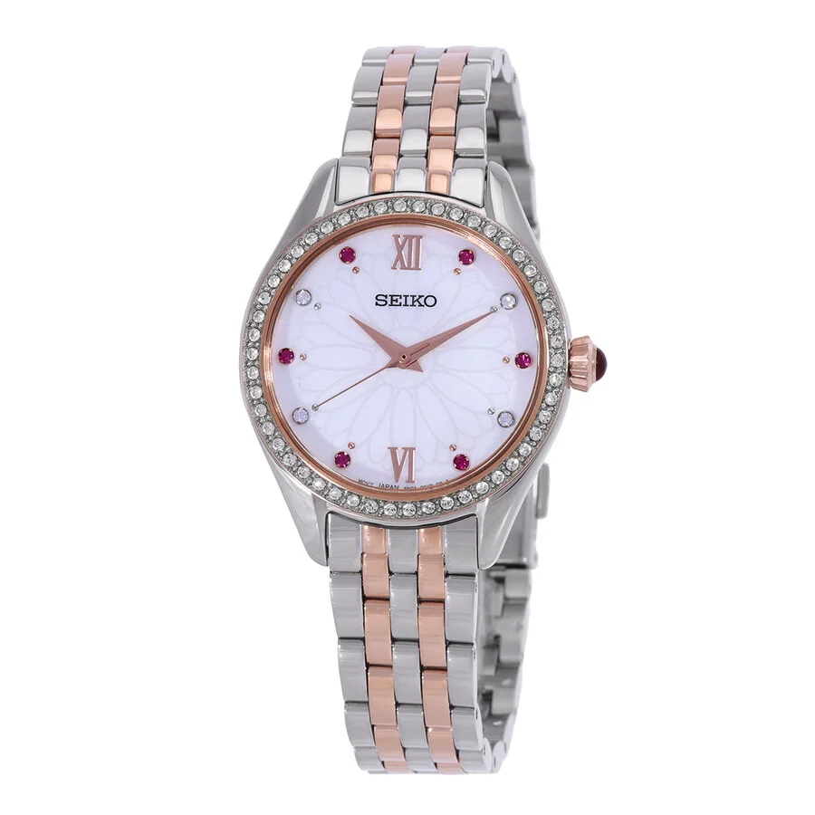 Silver-tone stainless steel case with a two-tone (silver-tone and rose gold-tone) stainless steel bracelet. Fixed silver-tone stainless steel bezel. Mother of pearl dial with rose gold-tone hands and Roman numeral & index hour markers. Dial Type: Analog. Quartz movement. Scratch resistant Hardlex crystal. Pull / push crown. Solid case back. Round case shape, case size: 26 mm, case thickness: 7 mm. Band width: 12 mm. Fold over clasp with a safety release. Water resistant at 30 meters / 100 feet. Functions: hour, minute, second. Quartz Series. Dress watch style. Watch label: Japan Movt. Seiko Quartz Mother of Pearl Dial Ladies Watch SUR542. GENERAL Box Type: Original Box CASE Case Diameter: 26 mm Case Thickness: 7 mm Case Material: Stainless Steel Case Shape: Round Case Back: Solid BAND Band Material: Stainless Steel Band Type: Bracelet Band Color: Two-tone (Silver-tone and Rose Gold-tone) Band Width: 12 mm Clasp: Fold Over with Safety Release DIAL Dial Color: Mother of Pearl Type: Analog Crystal: Scratch Resistant Hardlex Hands: Rose Gold-tone Dial Markers: Roman Numeral & Index Bezel: Fixed Bezel Color: Silver-tone Bezel Material: Stainless Steel Crown: Pull / Push INFORMATION Brand: Seiko Series: Quartz Collection Name: Quartz Gender: Womens Model: SUR542 Watch Label: Japan Movt Movement: Quartz FEATURES Water Resistance: 30 meters / 100 feet Functions: Hour, Minute, Second Watch Features: Analog, Gold, Stainless Steel ADDITIONAL INFO Watch Style: Dress Warranty: 3 Year Jomashop Warranty UPC Code: 4954628248602 Jomashop Sku: SE-SUR542 Department: Watches Category: Watches