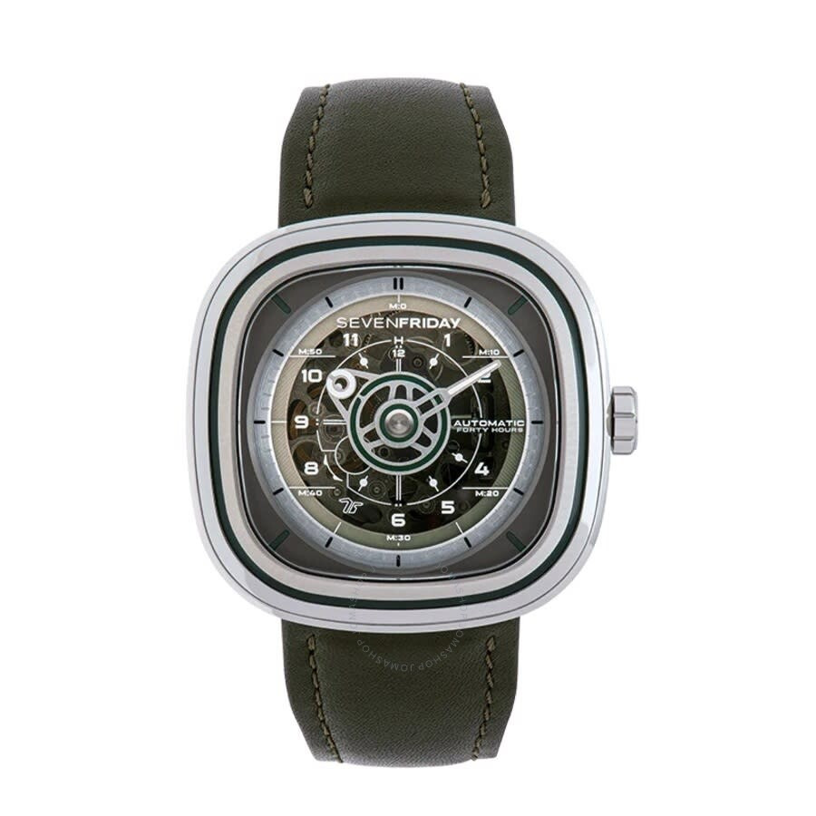 Silver-tone stainless steel case with a green leather strap. Fixed silver-tone stainless steel bezel. Green dial with silver-tone hands and Arabic numeral hour markers. Minute markers around the outer rim. Dial Type: Analog. Luminescent hands. Automatic movement. Solid case back. Cushion case shape, case size: 45 mm. Water resistant at 30 meters / 100 feet. Functions: hour, minute. Additional Info: "green-t". Green T Series. Casual watch style. Sevenfriday Green T Automatic Green Dial Men's Watch T1/06. GENERAL Box Type: Original Box CASE Case Material: Stainless Steel Case Shape: Cushion Case Back: Solid BAND Band Material: Leather Band Type: Strap Band Color: Green DIAL Dial Color: Green Type: Analog Hands: Silver-tone Dial Markers: Arabic Numeral Second Markers: Minute Markers around the outer rim Luminiscence: Hands Bezel: Fixed Bezel Color: Silver-tone Bezel Material: Stainless Steel INFORMATION Brand: Sevenfriday Series: Green T Collection Name: Green T Gender: Mens Model: T1/06 Movement: Automatic FEATURES Water Resistance: 30 meters / 100 feet Functions: Hour, Minute Watch Features: Stainless Steel, Leather, Analog ADDITIONAL INFO Watch Style: Casual Warranty: 2 Year Jomashop Warranty Additional Info: "GREEN-T" Jomashop Sku: SFR-T1-06 Department: Watches