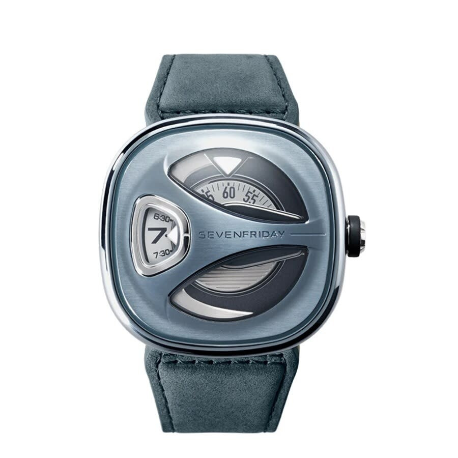 Silver-tone stainless steel case with a blue leather strap. Fixed silver-tone stainless steel bezel. Blue dial with silver-tone hands and Arabic numeral hour markers. Minute markers around the outer rim. Dial Type: Analog. Luminescent hands. TMI Caliber NH70 Automatic movement, containing 24 Jewels, bitting at 21600 vph, and has a power reserve of approximately 41 hours. Scratch resistant sapphire crystal. Solid case back. Cushion case shape, case size: 44.5 mm. Fold over clasp with a safety release. Water resistant at 50 meters / 165 feet. Functions: hour, minute, second. Additional Info: "stone blue". Me Series. Casual watch style. Watch label: Japan Movt. Sevenfriday ME Automatic Blue Dial Men's Watch ME3/01. GENERAL Box Type: Original Box CASE Case Material: Stainless Steel Case Shape: Cushion Case Back: Solid BAND Band Material: Leather Band Type: Strap Band Color: Blue Clasp: Fold Over with Safety Release DIAL Dial Color: Blue Type: Analog Crystal: Scratch Resistant Sapphire Hands: Silver-tone Dial Markers: Arabic Numeral Second Markers: Minute Markers around the outer rim Luminiscence: Hands Bezel: Fixed Bezel Color: Silver-tone Bezel Material: Stainless Steel INFORMATION Brand: Sevenfriday Series: Me Collection Name: ME Gender: Mens Model: ME3/01 Watch Label: Japan Movt Movement: Automatic Engine: TMI Caliber NH70 Power Reserve: 41 hours FEATURES Water Resistance: 50 meters / 165 feet Functions: Hour, Minute, Second Watch Features: Stainless Steel, Leather, Analog ADDITIONAL INFO Watch Style: Casual Warranty: 2 Year Jomashop Warranty Additional Info: "Stone blue" Jomashop Sku: Y-A5DU3 Department: Watches
