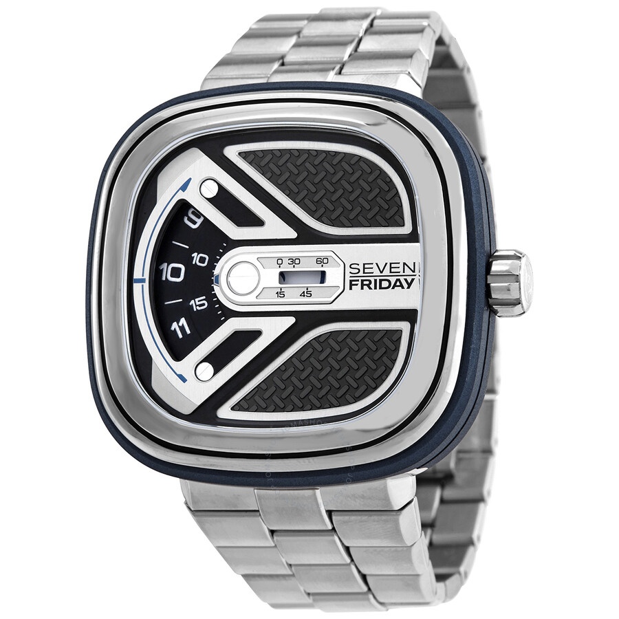 Dark blue PVD stainless steel case with a stainless steel bracelet. Fixed stainless steel bezel Black and silver dial. The time (hours and minutes) is displayed on rotating disks. Dial Type: Analog. Miyota caliber 8215 automatic movement, containing 21 Jewels, bitting at 21600 vph, and has a power reserve of approximately 42 hours. Scratch resistant hardened K1 mineral crystal. Pull / push crown. Solid case back. Square case shape. Case dimensions: 47.6 mm x 47 mm. Band width: 28 mm / 24 mm. Fold over clasp with a push button release. Water resistant at 30 meters / 100 feet. Functions: hour, minute, second. Urban Explorer Series. Sport watch style. Watch label: Japan Movt. Sevenfriday Urban ExplorerUrban Explorer Automatic Black Dial Men's Watch M1B/01M. CASE Case Size: 47 Case Material: Stainless Steel Case Shape: Square Case Back: Solid BAND Band Material: Stainless Steel Band Type: Bracelet Band Width: 28 mm / 24 mm Clasp: Fold Over DIAL Dial Color: Black Type: Analog Crystal: Hardened K1 Mineral Bezel: Fixed Bezel Color: Silver-tone Bezel Material: Stainless Steel Crown: Pull / Push INFORMATION Brand: Sevenfriday Series: Urban Explorer Collection Name: Urban Explorer Gender: Mens Model: M1B/01M Watch Label: Japan Movt Movement: Automatic Engine: Miyota Caliber 8215 Power Reserve: 40 hours FEATURES Water Resistance: 30 meters / 100 feet Functions: Hour, Minute, Second Watch Features: Stainless Steel, Analog ADDITIONAL INFO Watch Style: Sport Warranty: 2 Year Jomashop Warranty Jomashop Sku: SFR-M1B-01M Department: Watches Category: Watches
