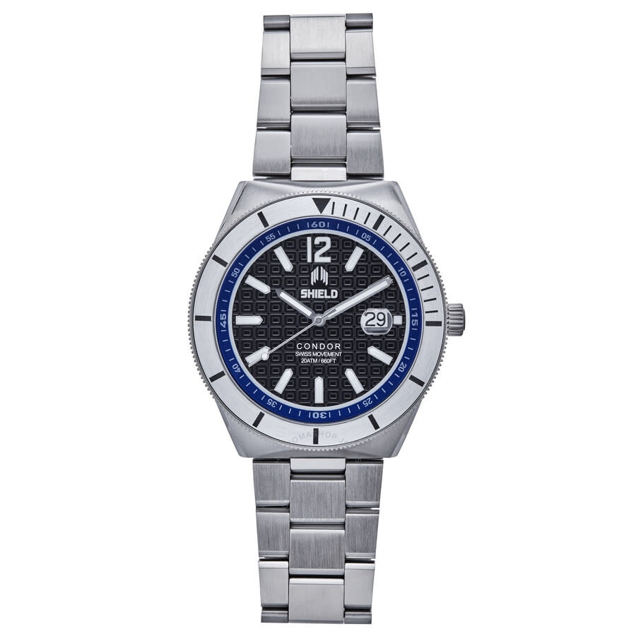 316L Surgical-Quality Stainless Steel Case Swiss Quartz Automatic Movement Sapphire-Coated Mineral Crystal Logo-Engraved Stainless Steel Caseback Uni-Directional Bezel Screw-Down Crown 316L Surgical-Quality Stainless Steel Bracelet Logo-Engraved Fold-Over Push-Button Deployment Clasp Luminous Hands Luminous Markers Magnified Date Indicator 46mm Diameter 20ATM Water Resistance (Professional Deep Diving Approved) CASE Case Size: 49 Case Thickness: 13 mm Case Material: Stainless Steel Case Shape: Round BAND Band Material: Stainless Steel Band Type: Bracelet Band Color: Silver-tone Band Length: 9 inches Band Width: 24 mm Clasp: Deployment with Push Button Release DIAL Dial Color: Black Type: Analog Crystal: Scratch Resistant Mineral Hands: Silver-tone Dial Markers: Arabic Numeral & Index Second Markers: Minute Markers around the outer rim Luminiscence: Hands Bezel: Uni-directional Rotating Bezel Color: Silver-tone Bezel Material: Stainless Steel Crown: Screw Down INFORMATION Brand: Shield Series: Condor Collection Name: Condor Gender: Mens Model: SLDSH118-2 Watch Label: Japan Movt Movement: Quartz FEATURES Water Resistance: 200 meters / 660 feet Calendar: Date display at the 3 o'clock position Functions: Date, Hour, Minute, Second Watch Features: Stainless Steel, Analog ADDITIONAL INFO Watch Style: Fashion Warranty: With Manufacturers Guarantee UPC Code: 840148810280 Jomashop Sku: Y-A4AQ8 Department: Watches Category: Watches