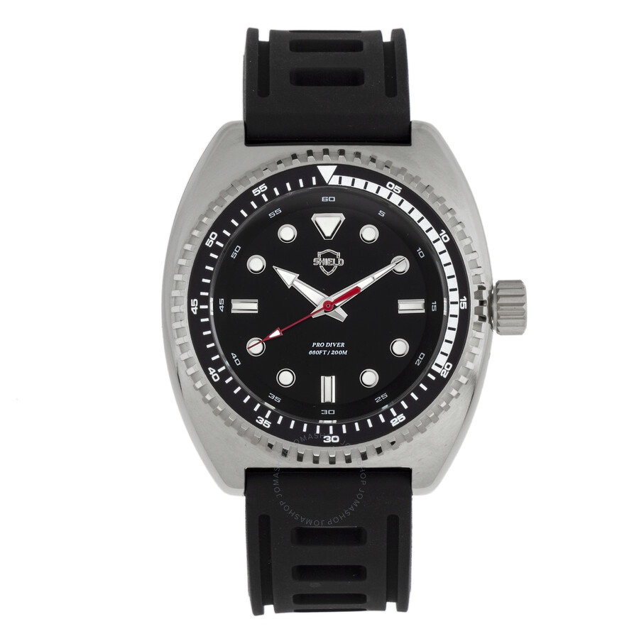 Silver-tone 316L surgical-quality stainless steel case with a black silicone strap. Uni-directional rotating black stainless steel bezel. Black dial with silver-tone hands and index hour markers. Dial Type: Analog. Luminescent hands and markers. Quartz movement. Scratch resistant mineral crystal. Screw down crown. Solid case back. Tonneau case shape, case size: 44 mm, case thickness: 15 mm. Band width: 22 mm. Buckle clasp. Water resistant at 200 meters / 660 feet. Functions: hour, minute, second. Dive watch style. Watch label: Japan Movt. Item Variations: SLDSH107-2. Shield Dreyer Quartz Black Dial Men's Watch SLDSH107-2. INFORMATION Brand: Shield Series: Dreyer Collection Name: Dreyer Gender: Mens Model: SLDSH107-2 Watch Label: Japan Movt Movement: Quartz CASE Case Size: 44 mm Case Thickness: 15 mm Case Material: 316L Surgical-Quality Stainless Steel Case Shape: Tonneau Case Back: Solid BAND Band Material: Silicone Band Type: Strap Band Color: Black Band Width: 22 mm Clasp: Buckle DIAL Dial Color: Black Type: Analog Crystal: Scratch Resistant Mineral Hands: Silver-tone Dial Markers: Index Luminiscence: Hands and Markers Bezel: Uni-directional Rotating Bezel Color: Black Bezel Material: Stainless Steel Crown: Screw Down FEATURES Water Resistance: 200 meters / 660 feet Functions: Hour, Minute, Second Watch Features: Stainless Steel, Analog ADDITIONAL INFO Watch Style: Dive Warranty: With Manufacturers Guarantee UPC Code: 847864193581 Jomashop Sku: SLDSH107-2 Item Variation: SLDSH107-2 Department: Watches Category: Watches