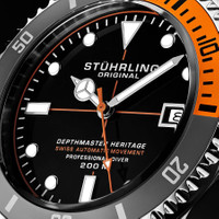 Stainless steel case with a stainless steel bracelet. Uni-directional rotating stainless steel bezel with an inlaid grey and orange ring. Black dial with luminous silver-tone Breguet-style hands and dot hour markers. Minute markers around the outer rim. Dial Type: Analog. Luminescent hands and markers. Date display at the 3 o'clock position. Claro calibre CL888 automatic movement, containing 18 Jewels, bitting at 21600 vph, and has a power reserve of approximately 38 hours. Scratch resistant Krysterna crystal. Screw down crown. Transparent case back. Round case shape. Case size: 42 mm. Case thickness: 11.8 mm. Band width: 22 mm. Band length: 8.5 inches. Deployment with push button release clasp. Water resistant at 200 meters / 660 feet. Functions: date, hour, minute, second. Dive watch style. Watch label: Swiss Movt. Stuhrling Original Aquadiver Automatic Black Dial Men's Watch M13518. INFORMATION Brand: Stuhrling Original Series: Aquadiver Collection Name: Aquadiver Gender: Mens Model: M13518 Watch Label: Swiss Movt Movement: Automatic Engine: Claro Calibre CL888 Power Reserve: 38 hours CASE Case Size: 42 mm Case Thickness: 11.8 mm Case Material: Stainless Steel Case Shape: Round Case Back: Transparent BAND Band Material: Stainless Steel Band Type: Bracelet Band Color: Silver-tone Band Length: 8.5 inches Band Width: 22 mm Clasp: Deployment with Push Button Release DIAL Dial Color: Black Type: Analog Crystal: Scratch Resistant Krysterna Hands: Luminous Silver-tone Breguet-style Dial Markers: Dot Second Markers: Minute Markers around the outer rim Luminiscence: Hands and Markers Bezel: Uni-directional Rotating Bezel Color: Silver-tone Bezel Material: Stainless Steel with a Grey and Orange Ring Crown: Screw Down FEATURES Water Resistance: 200 meters / 660 feet Calendar: Date display at the 3 o'clock position Functions: Date, Hour, Minute, Second Watch Features: Stainless Steel, Analog ADDITIONAL INFO Watch Style: Dive Warranty: With Manufacturers Guarantee UPC Code: 190638109937 Jomashop Sku: ST-OM13518 Department: Watches Category: Watches