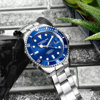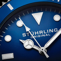 Stainless steel case with a stainless steel bracelet. Uni-directional rotating coin edge stainless steel bezel with an inlaid blue metallic ring. Blue dial with silver-tone Mercedes-logo, sword, and Breguet-style hands and dot hour markers. Minute markers around the outer rim. Dial Type: Analog. Luminescent hands and markers. Date display at the 3 o'clock position. Miyota caliber 8215 automatic movement, containing 21 Jewels, bitting at 21600 vph, and has a power reserve of approximately 42 hours. Scratch resistant Krysterna crystal. Screw down crown. Solid case back. Round case shape. Case size: 42 mm. Case thickness: 13.5 mm. Band length: 8 inches. Fold over clasp with a safety release. Water resistant at 200 meters / 660 feet. Functions: date, hour, minute, second. Aquadiver Series. Dive watch style. Watch label: Japan Movt. Stuhrling Original Aquadiver Automatic Blue Dial Men's Watch M13544. INFORMATION Brand: Stuhrling Original Series: Aquadiver Collection Name: Aquadiver Gender: Mens Model: M13544 Watch Label: Japan Movt Movement: Automatic Engine: Miyota Caliber 8215 Power Reserve: 42 hours CASE Case Size: 42 mm Case Thickness: 13.5 mm Case Material: Stainless Steel Case Shape: Round Case Back: Solid BAND Band Material: Stainless Steel Band Type: Bracelet Band Color: Silver-tone Band Length: 8 inches Clasp: Fold Over with Safety Release DIAL Dial Color: Blue Type: Analog Crystal: Scratch Resistant Krysterna Hands: Silver-tone Mercedes-logo, sword, and Breguet-style Dial Markers: Dot Second Markers: Minute Markers around the outer rim Luminiscence: Hands and Markers Bezel: Uni-directional Rotating Coin Edge Bezel Color: Silver-tone Bezel Material: Stainless Steel with a Metllic Blue Ring Crown: Screw Down FEATURES Water Resistance: 200 meters / 660 feet Calendar: Date display at the 3 o'clock position Functions: Date, Hour, Minute, Second Watch Features: Stainless Steel, Analog ADDITIONAL INFO Watch Style: Dive Warranty: With Manufacturers Guarantee UPC Code: 190638110193 Jomashop Sku: ST-OM13544 Department: Watches Category: Watches