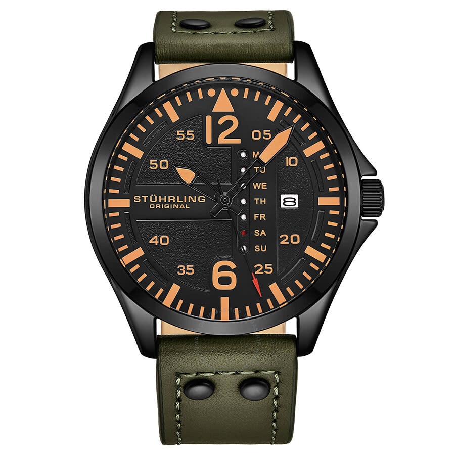 Black alloy case with a green leather strap. Fixed black alloy bezel. Black dial with luminous black hands and index hour markers. Arabic numeral minute markers (at 5 minute intervals). Minute markers around the outer rim. Dial Type: Analog. Luminescent hands and markers. Date display at the 3 o'clock position. linea day of the week. Quartz movement. Scratch resistant mineral crystal. Pull / push crown. Solid case back. Round case shape. Case size: 41 mm. Case thickness: 11 mm. Band width: 22 mm. Band length: 8.75 inches. Tang clasp. Water resistant at 100 meters / 330 feet. Functions: date, day, hour, minute, second. Aviator Series. Casual watch style. Stuhrling Original Aviator Quartz Black Dial Men's Watch M13666. INFORMATION Brand: Stuhrling Original Series: Aviator Collection Name: Aviator Gender: Mens Model: M13666 Movement: Quartz CASE Case Size: 41 mm Case Thickness: 11 mm Case Material: Alloy Case Shape: Round Case Back: Solid BAND Band Material: Leather Band Type: Strap Band Color: Green Band Length: 8.75 inches Band Width: 22 mm Clasp: Tang DIAL Dial Color: Black Type: Analog Crystal: Scratch Resistant Mineral Hands: Luminous Black Dial Markers: Index Second Markers: Arabic Numeral Minute Markers (at 5 minute intervals). Minute Markers around the outer rim Luminiscence: Hands and Markers Bezel: Fixed Bezel Color: Black Bezel Material: Alloy Crown: Pull / Push FEATURES Water Resistance: 100 meters / 330 feet Calendar: Date display at the 3 o'clock position. Linea Day of the Week Functions: Date, Day, Hour, Minute, Second Watch Features: Leather, Analog ADDITIONAL INFO Watch Style: Casual Warranty: With Manufacturers Guarantee UPC Code: 190638111411 Jomashop Sku: ST-OM13666 Department: Watches Category: Watches