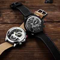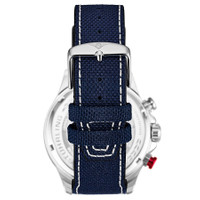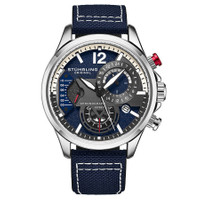 Silver-tone alloy case with a blue leather strap. Fixed silver-tone alloy bezel. Blue dial with luminous black diamond-shaped style hands and index hour markers. An Arabic numeral appears at the 12 o'clock position. Minute markers around the outer rim. Dial Type: Analog. Luminescent hands and markers. Date display at the 4 o'clock position. Two sub-dials displaying: 60 seconds and 24 hour. Quartz movement. Scratch resistant mineral crystal. Pull / push crown. Solid case back. Round case shape. Case size: 45 mm. Case thickness: 12.75 mm. Band width: 22 mm. Band length: 8.75 inches. Tang clasp. Water resistant at 30 meters / 100 feet. Functions: date, hour, minute, second, 24 hour with am/pm indicator. Aviator Series. Casual watch style. Stuhrling Original Aviator Quartz Blue Dial Men's Watch M13587. INFORMATION Brand: Stuhrling Original Series: Aviator Collection Name: Aviator Gender: Mens Model: M13587 Movement: Quartz CASE Case Size: 45 mm Case Thickness: 12.75 mm Case Material: Alloy Case Shape: Round Case Back: Solid BAND Band Material: Leather Band Type: Strap Band Color: Blue Band Length: 8.75 inches Band Width: 22 mm Clasp: Tang DIAL Dial Color: Blue Type: Analog Crystal: Scratch Resistant Mineral Hands: Luminous Black Diamond-shaped style Dial Markers: Index Second Markers: Arabic Numeral appears at the 12 o'clock position. Minute Markers around the outer rim Sub Dials: Two - 60 Seconds and 24 Hour Luminiscence: Hands and Markers Bezel: Fixed Bezel Color: Silver-tone Bezel Material: Alloy Crown: Pull / Push FEATURES Water Resistance: 30 meters / 100 feet Calendar: Date display at the 4 o'clock position Functions: Date, Hour, Minute, Second, 24 Hour with AM/PM Indicator Watch Features: Diamond, Leather, Analog ADDITIONAL INFO Watch Style: Casual Warranty: With Manufacturers Guarantee UPC Code: 190638110629 Jomashop Sku: ST-OM13587 Department: Watches Category: Watches