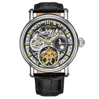 Silver-tone alloy case with a black leather strap. Fixed silver-tone alloy bezel. Black skeleton dial with gold-tone leaf-style hands and index hour markers. Dial Type: Analog. Two sub-dials displaying: am/pm indicator and dual time. Automatic movement. Scratch resistant mineral crystal. Pull / push crown. Transparent case back. Round case shape. Case size: 43 mm. Case thickness: 12 mm. Band width: 22 mm. Band length: 9 inches. Tang clasp. Water resistant at 30 meters / 100 feet. Functions: hour, minute, am/pm indicator, dual time. Legacy Series. Dress watch style. Stuhrling Original Legacy Automatic Black Dial Men's Watch M13581. INFORMATION Brand: Stuhrling Original Series: Legacy Collection Name: Legacy Gender: Mens Model: M13581 Movement: Automatic CASE Case Size: 43 mm Case Thickness: 12 mm Case Material: Alloy Case Shape: Round Case Back: Transparent BAND Band Material: Leather Band Type: Strap Band Color: Black Band Length: 9 inches Band Width: 22 mm Clasp: Tang DIAL Dial Color: Black Skeleton Type: Analog Crystal: Scratch Resistant Mineral Hands: Gold-tone Leaf-style Dial Markers: Index Sub Dials: Two - AM/PM Indicator and Dual Time Bezel: Fixed Bezel Color: Silver-tone Bezel Material: Alloy Crown: Pull / Push FEATURES Water Resistance: 30 meters / 100 feet Functions: Hour, Minute, AM/PM Indicator, Dual Time Watch Features: Leather, Gold, Analog ADDITIONAL INFO Watch Style: Dress Warranty: With Manufacturers Guarantee UPC Code: 190638110568 Jomashop Sku: ST-OM13581 Department: Watches Category: Watches